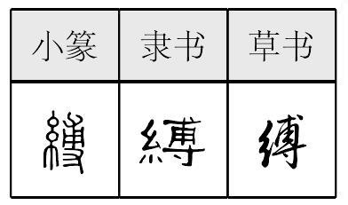 另见:施加 限制 束缚 规定 范围 放纵 ☚ 约束 自律 ☛ 缚縛fù符䦆切,入药。 ❶捆绑,束缚。《墨子·备穴》:“穴土而入,~柱施火。” ❷捆绑的绳索。《史记·淮阴侯传》:“解其~,东向坐。” 缚fú捆绑。如:束缚,手无缚鸡之力。 缚(縛)fù (捆绑) bind;tie up: 反 ~ hands tied behind the back; 束 ~ bind up;fetter;tie; 手无 ~ 鸡之力 lack the strength to truss a chicken — physically very weak ◆缚鸡之力 strength for binding a chicken;strengh to truss a chicken — physically very weak 缚fù❶ 缚鸡之力|缚手缚脚|缚手无策