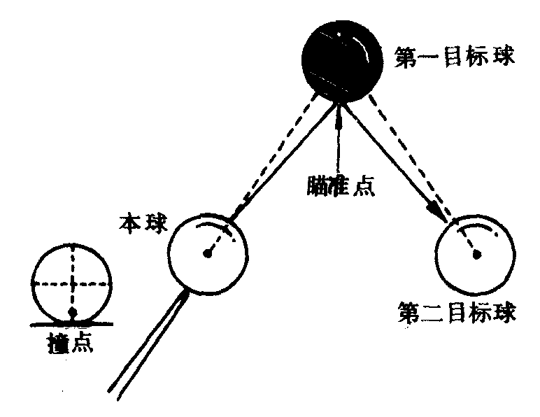 | 释义 | 缩球杆法 缩球杆法台球击球的一种方法。是用撞点为中下部的杆法击球,本球边逆旋边向前进碰撞第1目标球,但是本球仍旧能向后返回碰撞第2目标球。缩球的基本瞄准方法是以3个球的中心连结线,再将其顶点二等分,找出一条线,并与第1目标球的近端相接,该点即为瞄准点。(见图2—3—40)