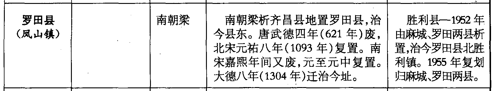 罗田县(凤山镇)南朝梁南朝梁析齐昌县地置罗田县,治今县东。唐武德四年(621年)废,北宋元祐八年(1093年)复置。南宋嘉熙年间又废,元至元中复置。大德八年(1304年)迁治今址。胜利县—1952年由麻城、罗田两县析置,治今罗田县北胜利镇。1955年复划归麻城、罗田两县。