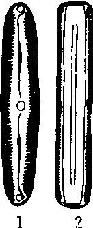 | 释义 | 羽纹藻属Pinnularia金藻门,舟形藻科。细胞壁富含硅质,由两套合的半片组成的单细胞浮游藻类。淡水产,通常分布于浅水水体。细胞舟形,正面观(壳面或瓣面)近长椭圆形,中部略横向膨大,四角稍圆;侧面观(环面或带面)呈长方形。壳面沿边两侧具对称的横条花纹。中部有一中央节,两端各有一极节(端节)。细胞单核。两片黄褐色的色素体分别位于相对的两个环面。主要以细胞分裂进行繁殖。可作为鱼、虾、贝等水生生物的饵料。种类甚多,常见的有著名羽纹藻(P.nobilis Ehr.)、大羽纹藻〔P.maior(Kutz.)Cl.〕等。 羽纹藻属 1.正面观(瓣面) 2. 侧面观(环面) |
