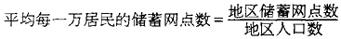 反映储蓄网点在地域上或人口中分布的疏密程度的指标。计算公式有两种:❶ 储蓄网点密度正指标,公式为: