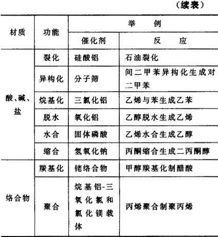 | 释义 | 催化剂 1976年国际纯粹应用化学学会(IUPAC)公布的催化作用的定义为:催化作用是一种化学作用,是靠用量极少而本身不被消耗的一种叫做催化剂的外加物质来加速化学反应的现象。 因此,催化剂是一种物质,它通过基元步骤的不间断地重复循环,将反应物转变为产物,在循环的最终步骤催化剂再生为原始状态。更简单地说,催化剂是一种加速化学反应而在其过程中自身不被消耗掉的物质。 若其作用是使反应减速,则称负催化剂。 催化剂可以是气态物质、液态物质或固态物质,还有些以胶体状态存在。在催化剂工业中,主要产品是固体催化剂。在某些反应中,单一的元素或化合物可作为催化剂,但在多数场合为了使催化剂具备特定的性能,常由几种成分配合而成。各种组分按作用的不同可分为催化活性组分、助催化剂、催化剂载体等。活性组分是使催化剂具备活性所必需的成分;助催化剂单独存在时不呈现所需要的催化活性,但与催化活性组分共存时则可改善后者的催化性能;催化剂载体是负载型催化剂的组成之一,催化活性组分担载在载体表面上,载体主要用于支持活性组分,使催化剂具有特定的物理性状,而载体本身一般并不具有催化活性。 催化剂按来源可分为生物催化剂和非生物催化剂。后者是目前大多数的工业催化剂,都是由人工合成,且具有特定组成和结构的制品。多数固体催化剂还具有特定的形状,其制造方法也各异,具体的工业催化剂有两种分类方法,(1)按材质分类;(2)按功能分类。如表7-3-5所示。 表7-3-5