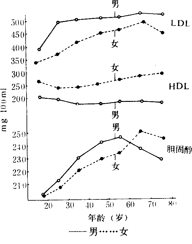 随着年龄的增长,血清中胆固醇和低密度脂蛋白均明显增加,而高密度脂蛋白基本不变(如图),所以老年人易发生动脉硬化现象。