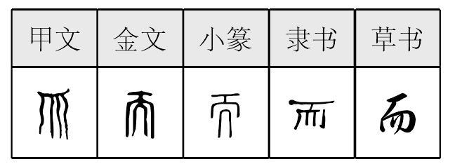 而 甲骨文; 金文; 篆ér[象形,像人下巴上的鬍鬚。《説文》:“而,須也。象形。周禮作鱗之而。”而,像鬚髮下垂,象形,擬爲須本字。或謂金文像人站立形作爲第二人稱,借聲爲“爾”“汝”“你”。如“知而無罪”即“曉得你没有罪”。借爲連詞:相互補充〈忙而不亂、肥而不膩〉;語意相承〈占而有之、取而代之〉;表示轉折(從少年而到長出鬍鬚,是人生的一大轉折)〈當作而不作,將失良機〉;表示到達〈由南而北、由東而西〉;表示並立〈茶香而酒醇〉。與“能”“耐”通。] 《詩經·鄘風·相鼠》:“相鼠有皮,人而無儀。”(老鼠都有皮,人却無威儀。) 《論語·學而》:“子曰:‘學而時習之,不亦説乎?’”(孔子説:“把學得的知識,經常複習,不也很快樂嗎?”) 而(ér)“ ,颊毛也。象毛之形。《周礼》曰:‘作其鳞之而。’凡而之属皆从而。臣铉等曰:今俗别作髵,非是。”(如之切) 徐锴《系传》:“象颊毛连属而下也。” 金文作 、 。徐灏《注笺》:“而、耏古今字。因借为语词,加彡作耏。又借为尔我之称,而、尔一声也。”金文中有第二人称代词用法,如越王钟:“歖(喜)而(尔)宾各(客)。”金文中还可用作连词,如中山王壶:“为人臣而 (反)臣其宗。”[1]战国包山楚简作 、 ,上博简作 。 而部只有一个属字“耏”,云:“罪不至髡也。从而,从彡。耐,或从寸。诸法度字从寸。” 而ér(6画)