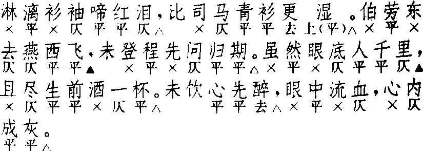 | 释义 | 耍孩儿 耍孩儿曲牌名。参见“常用曲谱”类。 ☚ 锁南枝 寄生草 ☛ 耍孩儿 耍孩儿戏曲剧种。又称“咳咳腔”。历史甚为古老。据考证,可能是由金元时期的[般涉调·耍孩儿]演变而成。在山西北部大同一带流行。脚色分红、黑、生、旦、丑五行,在表演上舞蹈性很强。传统唱法使用后嗓子,近于佛教音乐的发声。以呼胡为主要伴奏乐器。在艺术上和山西北部各种道情戏颇多共同之处。 ☚ 上党梆子 河北梆子 ☛ 耍孩儿 耍孩儿❶民间曲调名。五十四字,平仄通协。字数定格与南北曲《耍孩儿》不同。明人所编《玉谷调簧》中收有二十余首。 ☚ 锁南枝 寄生草 ☛ 耍孩儿 耍孩儿戏曲剧种。又名咳咳腔。一说为金元北曲〔耍孩儿〕发展形成,流行于山西大同及雁北地区。基本唱腔为平曲子,以八句唱词为一段,音调哀怨委婉。表演动作舞蹈性强。剧目有《千里送京娘》、《花园会》、《狮子洞》、《金木鱼》等。 ☚ 赛戏 越调 ☛ 耍孩儿 耍孩儿王实甫 《西厢记》 ![]() 全曲九句:7△,6△。7▲,6△。7▲,7△。3△,4,4△。第二句宜叶上声韵。第七句散套有不叶韵者,此系沿袭诸宫调作法之故。第五、六句对。第八、九句对。散套首牌,〔哨遍〕套次牌。剧套联入套中,可独用入套。一名〔魔合罗〕,只出现在剧套中。有幺篇,同前篇,散套用之。亦入〔正宫〕、〔中吕〕。《北词广正谱》谓借入〔双调〕,原注“缺”。出于诸宫调,全同。与南曲异。 ☚ 哨遍 煞 ☛ 耍孩儿 耍孩儿许自昌 《水浒记》 ![]() 全曲七句:7△,5▲,7△。2▲,8△,8△,6△。《南词简谱》谓:第二句“可以叶韵,惟普通格式概不叶也”。第四句二字句,一般也不叶韵。时有误题〔红衫儿〕,如《拜月亭·皇华悲遇》、《邯郸记·召还》。与诸宫调、北〔般涉调·耍孩儿〕均不同。 ☚ 红芍药 会河阳 ☛ 耍孩儿 耍孩儿民间曲调名。一般七句四十一字。平仄通叶。明人景居士选辑《时兴滚调歌令玉谷新簧》卷一,载有二十馀首《时兴各处讥妓耍孩儿歌》,一式皆是七、七、七、七、三、三、七的句格,与南北曲之〔耍孩儿〕字数句格都不同。沈德符在《野获编·时尚小令》里说:“自兹(按指成化、弘治年间)以后,又有〔耍孩儿〕、〔驻云飞〕、〔醉太平〕诸曲,然不如三曲(按指〔锁南枝〕、〔傍妆台〕、〔山坡羊〕)之盛。”道出了当时〔耍孩儿〕流行的实际状况。 ☚ 锁南枝 寄生草 ☛ 耍孩儿(一) 戏曲曲牌名,元王实甫《西厢记》第二折[耍孩儿]:“当初那巫山远隔如天样,听说罢又在巫山那厢。……怪黄莺儿作对,怨粉蝶儿成双。” (二) 清代民间小曲,今山东、山西某些地方戏里尚有这一曲调。 耍孩儿 耍孩儿曲牌名。南北曲均有同名曲牌。南曲属中吕宫、般涉调。北曲属般涉调,较常用。字数定格及韵式据清·周祥钰《九宫大成谱》,作七、七、七、六、七、七、三、四、四、(九句)。亦入北曲正宫、中吕宫、双调。或用作小令,或用于般涉调,正宫或中吕宫套曲内。如昆剧《邯郸记·三醉》吕岩下场时所唱。京剧里有同名伴奏乐曲,也叫〔娃娃〕。以海笛演奏,多用为节奏缓慢的武打场面的伴奏。民间亦有同名曲调。五十四字,平仄通协。明人选辑《玉谷调簧》中收有二十余首。今山东、山西等戏里还保留着这一曲调。 ☚ 红衲袄 满庭芳 ☛ |