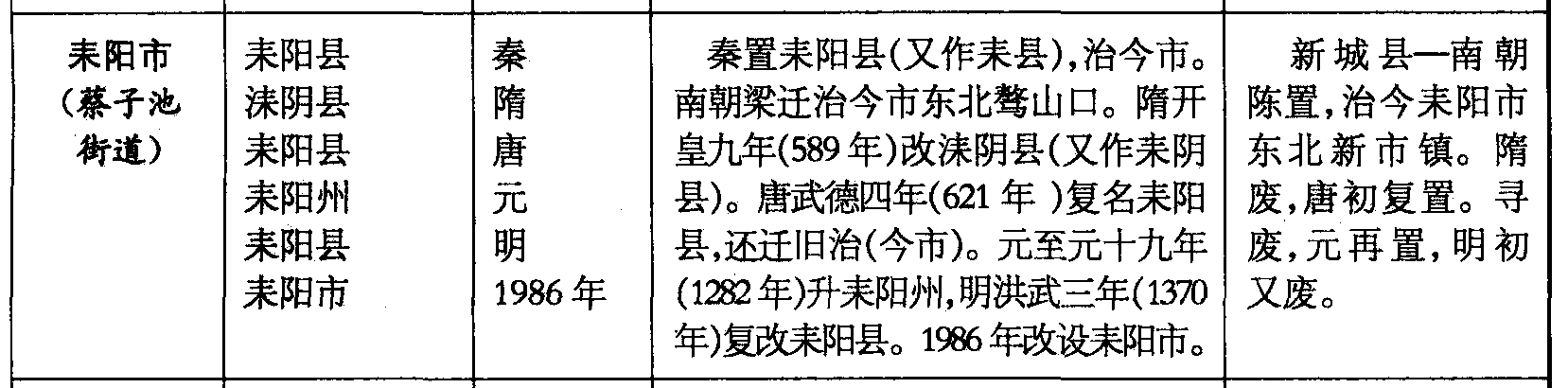 耒阳市(蔡子池街道)耒阳县洡阴县耒阳县耒阳州耒阳县耒阳市秦隋唐元明1986年秦置耒阳县(又作耒县),治今市。南朝梁迁治今市东北骜山口。隋开皇九年(589年)改洡阴县(又作耒阴县)。唐武德四年(621年)复名耒阳县,还迁旧治(今市)。元至元十九年(1282年)升耒阳州,明洪武三年(1370年)复改耒阳县。1986年改设耒阳市。新城县—南朝陈置,治今耒阳市东北新市镇。隋废,唐初复置。寻废,元再置,明初又废。
