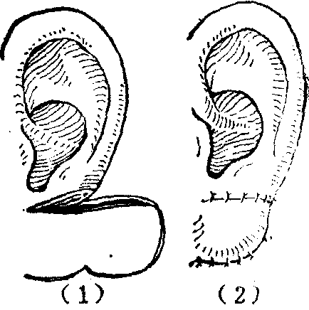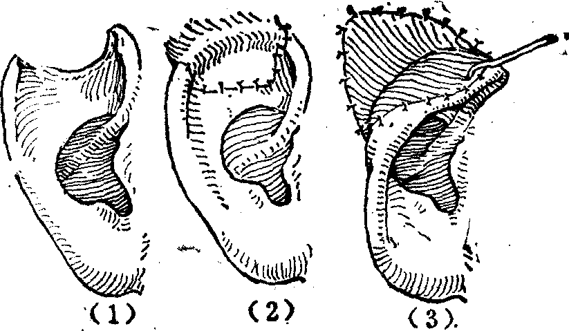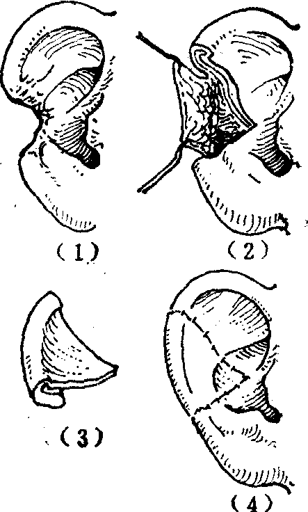 图1 耳轮推进缝合法修复耳轮缺损 局部皮瓣法也常用于耳廓缺损的修复。如耳前局部皮瓣可用于耳轮脚部的修复(图2),耳后乳突部的局部皮瓣结合软骨移植支架,常用于耳轮和耳廓部分缺损的修复(图3)。还可将皮瓣自相折合用以修复耳垂(图4)。