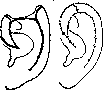 图6 耳轮全缺损用细长皮管修复 软骨移植用以构成修复缺损的支架。如所需面积不甚大时,可自同侧或对侧耳甲切取(图7)。切取后耳甲不致变形。如需用软骨很多且需雕刻造型时,则须自肋软骨取材。