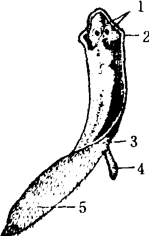图87 涡虫的耳突1.眼点 2.耳突 3.口4.咽 5.纤