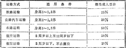 对儿童的优待票价。我国现行铁路运输、公路汽车运输、水路运输、航空运输对儿童票价适用条件与票价水平规定不一。见表八: