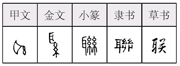 lián表意,甲骨文、金文从耳从糸,小篆把糸改为絲,表示以丝(絲)贯穿器耳,隶定为“聯”。本义为联缀,引申为连接在一起、对联(相连而对仗的两个语句)等。清代俗字、《手头字》、《简体字表》、《简化字表》简作“联”,据草书楷化。 【辨析】 ❶“联结、联袂、联翩、关联”也作“连结、连袂、连翩、关连”,现在的推荐写法是前者。 ❷联/连/缀 见242页“连”。 |