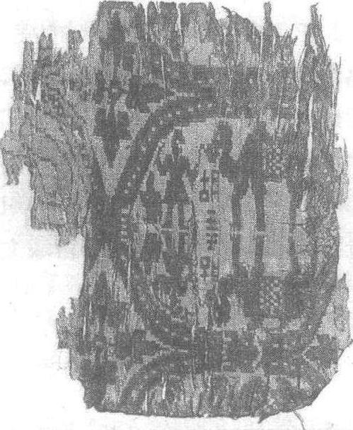 隋。长19.5厘米,宽15厘米。1965年新疆维吾尔自治区吐鲁番阿斯塔那延昌二十九年(公元589年),唐绍伯墓出土。新疆维吾尔自治区博物馆藏。此锦为三重三枚平纹组织,在米黄色地上,以墨绿色和绛红、橘红等交换排列的彩条经线显花,每一花纹循环单位有一胡人执鞭牵驼,间以汉文“胡王”二字,外围有半圈联珠纹,再将其“花木”反复倒置循环提花,织成上下对称形象的图案花纹。尚残存有幅边。此织锦每平方厘米经线48根,纬线为32根,经线直径为0.3毫米,纬线直径为0.2毫米。以“胡王”两汉字,可知织作此锦的为汉人,且汉人在当时被称为“胡人”。