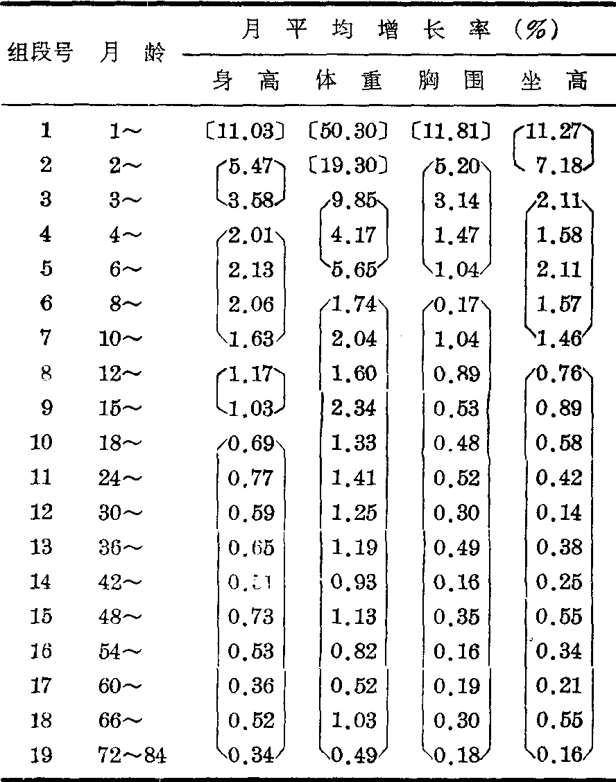 2值最大的Xi作为该类的典型变量。本例的典型变量为第Ⅰ类中的X13、第Ⅱ类中的X2、第Ⅲ类中的X8,故以这三个变量作为分型特征。再经过一些必要的数学处理,就可将牙槽弓分成若干型。例2 为了研究儿童生长发育的分期,调查了某县1253名1月~7岁男孩的身高(cm)、体重(kg)、胸围(cm)及坐高(cm)四项特征(变量),试根据这些特征的不同变化速度将1月~7岁分为几个生长发育阶段。 本例与例1不同,须考虑分类对象的秩序,它是一种有序资料的聚类,分析时先将出生后1足月到7足岁这段时期预分为19个阶段。然后,以出生时的各特征值为基础分别求出第一段中各变量的月平均增长率,其后各段则以前段的各特征值为基础分别计算出每段中各变量的月平均增长率。结果见表4。 表4 1253名1月~7岁男童的生长发育情况