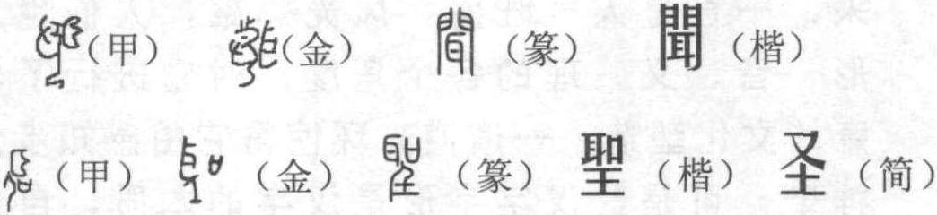 (甲) 聖音通 “盛”。“聖” 自从甲骨文 “聽”的义项中分化出来以后,走势看好。几千年以来,一直是人气旺盛,风光彩耀,人们也从形、音、义、理的各个角度,对它进行了刻意的文化塑造,一道道光环使得它由感知步入神聖。可是,汉字字形是汉字的本质,自从聖、圣、抠三字的相互换位,视觉上使得“聖” 身后的那些光环,一下子变成了许多怪圈,先聖不就成了 “先抠”,大聖也成了 “大抠”,神聖变成了 “神抠” ? 如今这 “神抠”,棋布神州。 “闻” 是 “聽” 的意思,但是 “闻” 不等于、不全是“聽”。 不然在甲骨文时期, 怎么能同时造出“𦔻”(聽) 与“闻”两个形体的文字来呢? “聽”和“闻”,说起来都是“耳边风”,但在古代,闻是闻,聽是聽,既毫不含糊,也毫不马虎。在“闻”的意境里,闻是聽一聽而已; 而在“聽”的意境里,聽而不闻却是万万不行的。——“聽见了没有” ! 它的潜台词是: “不可当作耳边风”。 “聽”的真实意境是山雨欲来的“满楼风”,而“闻”就通着“文”,同样是“耳边风”,它就来得徐稳,来得悠然,来得文气绉绉。孔子说“朝闻道,夕死可矣”,并由此造就了一代贤聖,于是我们就从“闻”、“聖”二字说开去。