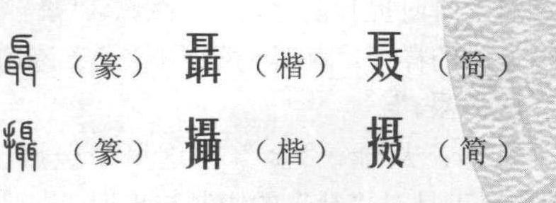 (篆) 耳朵是用来接收声音的,无论从“聶”的本意,还是从“聶”所组构的汉字,无一例外地都未透露“聶”曾有过发音的功能。因此《说文》:“聂,附耳私小语也。”显然是违反常识,其科学性肯定是靠不住的,即使哑语中的体位动作,也没聽过有耳朵的份儿,更何况许多耳朵呢。 聶,甲骨文、金文未见,它见于小篆,大概是秦汉以前最早也是春秋战国时的造字。 唐·韩愈有诗云:“足将前而趑趄,口将言而囁嚅”,(《送愿归盘谷序》)古代称人欲言又止为“囁嚅”,还有人戏白居易为囁嚅翁。为何称他为“囁嚅翁”呢?是说他懦弱畏事。懦弱畏事是人性中的普遍现象,古人是用一个“聶”来概括的。