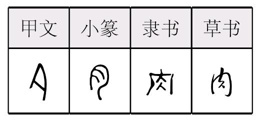 ròu象形,甲骨文、小篆象一块肉之形,隶定为“肉”。本义为切成大块的禽兽的肉,供食用,引申为人肉或动物的肉(体内接近皮的柔韧的物质)、某些瓜果里可食用的部分等。 【辨析】 ❶以“月(肉)”作意符构成的字大致可分为四类:a.指人和动物的肢体、器官等,如“肱、臂、肩、肘、股、胯、胫、腿、脚、膝、脊、背、胸、臀、脸、腹、脏、肚、腰、肝、肺、肾、胃、脾、肠、胆、膀胱、脑、脂肪、腱、肌、肤”;b.指肉体、后代、生育等,如“胚、胎、胞、育”;c.指肥瘦、病变、气味等,如“肥、肿、胀、脓、腐、臊、膻”;d.指有关肉食方面的,如“脍、膳、肴、腊、腌、脔、脩”。 ❷肉/肌 这两个字都有肉义,但有微别:在先秦时代,通常“肉”用于禽兽,“肌”用于人;只有在“骨”“肉”连用或并举时,“肉”才可以指人的肉。汉代以后,“肉”也用于人,而“肌”不用于禽兽。肉 (ròu)胾肉也。胾,大臠也。 【按】胾,音zì,切成大塊的肉。臠,音luán,切成小塊的肉。 肉 ☚ 戎 育 ☛ 00000566 |
