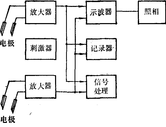 图2 三种针形电极 维的电活动。由于两芯极间距小,有较强的抗干扰能力; ❸多极针形电极: 多极针形电极是为确定运动单位的范围和测量单个峰形电位的空间范围而设计的。在一个空心针管内装入16~24根绝缘的铂金丝,各铂金丝的末端以相同的间距,顺针管轴向排列于空心针管侧部,即成了多极针形电极。针管或其中某一电极接地,其余电极为信号电极〔见图2(c)〕。 肌电信号处理 肌电测量时,常需要对图形特征进行定量描述。用人工肉眼的方法对肌电图分析费时费力,而且不精确,因此,信号处理技术日渐增多地应用于肌电的定量分析。常用方法如下: (1)肌电积分: 为了观察肌紧张水平随时间的变化,或了解肌收缩时参与收缩的运动单位数量,可用肌电积分法。它采用积分电路对肌电信号积分,获得肌电信号的平均电压,并用笔描记录器记录其随时间的变化,以观察肌电变化的趋势。经研究证明,在肌等长收缩时,积分电压与肌收缩强度成线性关系,可以绘出二者的关系曲线,用它能方便地研究肌肉的自主收缩。由于在肌等长收缩时,积分电压与参加收缩的运动单位数量有关,就可以用该曲线测定在一定的肌收缩水平上参加收缩的运动单位的数量。在肌疲劳、肌营养不良等情况下,由于要维持一定的肌收缩水平,需要更多的运动单位参加收缩,曲线的斜率就会改变。 (2)信号平均: 检测到的肌电信号经常是很微弱的,例如在诱发肌电测量时,信号甚至淹没在噪声之中。为了把微弱的肌电信号检测出来,可用信号平均技术。因为肌电信号有一定的规律性,而噪声却是随机的,将肌电信号叠加N次后,肌电信号幅度将增加N倍,噪声幅度仅增加 倍,提高了信-噪比,就可以把淹没在噪声中的信号提取出来。叠加次数应根据信号与噪声的相对值而定。信号平均技术除用于检测微弱的肌电信号外,还可以用于从干扰型肌电图中分离单个运动单位的活动电位。(3)谱分析: 谱分析是从频域上揭示肌电信号的特征。模拟方法是用多个中心频率不同的带通滤波器,覆盖肌电的频谱范围,测量各滤波器的输出,获得肌电能量在频域上的分布特性。目前已广泛地采用计算机来实现谱分析。肌电信号经过模-数变换转换为数字信号,然后用计算机处理,就可以获得肌电信号的频域特性,它反应了肌电信号的幅频特性。可用于正常肌肉及肌疲劳、肌营养不良等情况下对肌电信号特征进行分析。 (4)相关分析: 为了识别同一运动单位的活动电位或测定肌电图主运动单位的平均时限,可采用相关分析。相关分析是用计算机分析肌电信号与参照肌电信号的相关性,利用电子计算机,可绘出随时间变化的相关曲线。相关性好,曲线呈周期性重复。 (5)肌电图参数的自动分离: 这种方法是从时域上来揭示肌电图的变化特征。在临床上,对孤立型肌电图,习惯从它的首相极性、相数、时限、幅度来分析波形特征;对于干扰型肌电图则主要从发放脉冲的最大幅度和频率等来分析。采用自动分析方法时,可用特殊设计的电路或用电路与计算机结合的方法,自动分离并计算这些参数,这是目前比较倾向的一种自动分析方法。分离各种参数的方法很多,但大多数都不尽完善。如用电路分离并计算肌电波的过零点数和峰点数; 用一定幅度的阶梯电压,测定肌电的峰值和频率;用多个阈值不同的甄别器分析肌电脉冲的最大幅度和幅度谱。目前已有特殊设计的电路,能同时把肌电波的首相极性、相数、峰幅度、频率分离出来,还可输出肌电信号的积分电压与平均电压。 ☚ 脑电测量 神经电测量 ☛ |