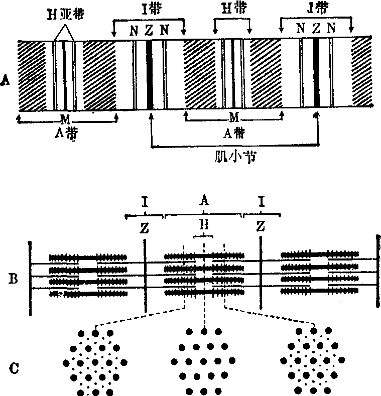 骨胳肌肌原纤维带示意图 脊椎动物骨胳肌肌原纤维的粗肌丝基本上只含有肌球蛋白,细肌丝除其主要组分肌动蛋白外,还有原肌球蛋。白和原宁蛋白组。 肌球蛋白分子具有三磷酸腺苷水解酶活力,能和肌动蛋白分子结合,分子的外形大体上呈一端带有两个球状结构头部的棒状物。它由两根多肽链组成,它们大部分复合成为分子的棒状部分,而每一根多肽链都在其一端形成一个球状区。在每根粗肌丝的中点,两个肌球蛋白分子以没有球状结构的端头互相连接,然后向肌丝的两个端,头以分子棒状部分中长约50nm的一段直线连接延伸。分子棒状结构的剩余部分加上两个球状结构部分,则向外突出成为横桥。肌动蛋白是一种球蛋白,在水溶液中分子大体上呈长轴约为5.4nm的椭球体,在一定浓度的盐溶液中易于直线聚合。两根聚合后的肌动蛋白丝也复合成为麻花状结构,原肌球蛋白和原宁蛋白分子则位于这个结构的两个凹槽中,两者相间排列。 目前认为,在肌纤维静息时,原肌球蛋白在细肌丝凹槽中的位置正好挡在由粗肌丝伸出的横桥和细肌丝中的肌动蛋白之间,使两者不能互相作用。肌纤维活动时,由于肌浆钙离子浓度升高,通过原宁蛋白使原肌球蛋白的位置发生改变,横桥和肌动蛋白分子得以接触相互作用,横桥发生摆动,将细肌丝向粗肌丝间隙中拉曳,产生张力。 收缩系统的力学性质 静息肌肉稍微受到张力时,呈现类似橡皮的弹性性质。温度上升,张力减小;温度下降,张力加大,即受热时缩短,冷却时伸长。肌肉所受张力较大时的情况则相反。这时肌肉收缩性质和正常弹性体相同。肌肉的负荷越大,最大收缩速度越慢,两者的关系可以用下式表示: (P+a)(v+b)=常数 式中P为加于肌肉的力,v为收缩速度,a、b为常数。 收缩的热力学问题 肌肉在静息时不断产生热量,活动时产热率增加。 ❶肌肉静息时的产热: 安静的青蛙缝匠肌在20℃时的产热率约为0.002cal/g·min,温度系数Q10约为2.5。这部分产热大体上是由维持肌肉内环境恒定和组成部分不断更新所需的功能活动供给。如果人的肌肉产热情况与此相仿,则在静息时肌肉的耗氧量约占基础代谢的20%左右。在无氧情况下,肌肉产热减少一半,无氧代谢产物积聚。如果缺氧不太严重,肌肉在重新获氧后恢复过程中,可产生额外的热量。 ❷等长收缩的产热: 等长收缩时的额外产热有以下一些: 如激活热,这部分产热在肌肉活动早期出现,和肌肉的张力无关,约为5mj·g-1。它除和动作电位的发生有关以外,主要和肌肉活动早期细胞内钙离子释放和结合的相关过程有关; 以及维持热,肌肉在作强直等长收缩时的另一部分产热,其中相当大一部分也和细胞内钙离子的释放和再积聚的过程有关。 ❸非等长收缩时的产热。一块肌肉接受强直刺激时,如果长度缩短,产热率比静息时大,这部分超过的产热称为缩短热,其产生率和缩短速度成正比。此时肌肉的能量释放率 + 为: + =(0.16P0+0.18P) +P +![]() 式中P0为等长收缩张力, P为负荷, 为缩短距离,M为等长收缩时维持热产生率。❹舒张热: 肌肉作等张收缩后再作等张舒张,缩短时肌肉对负荷做的功,在舒张时转换成热释放出来。 ❺延迟热: 指肌肉在机械变化结束后,恢复时的产热。 ☚ 视觉过程的生物物理学 生物系统热力学 ☛ |