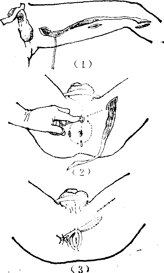 (3) 股薄肌肌瓣移转括约肌成形术: 括约肌广泛缺损或因神经损伤所致括约肌功能丧失时适用。手术原则为将股薄肌的下2/3一段从大腿内侧分离,切断其在胫骨内侧的止点,形成以上端为蒂的肌瓣。分离时应特别注意不可损伤其从近大腿根部进入肌肉的血管神经束。然后将肌瓣引入环绕肛门所剥出的皮下隧道内,绕肛门一周,在适当张力下,将肌瓣远端的肌腱缝合固定在对侧坐骨结节的骨膜及提肛肌上(图2)。如患者较胖,亦可固定在腹股沟韧带内端及内收长肌肌腱上。术后须进行训练,借外展大腿使肛门紧缩,内收大腿和弯腰使之放松,以行使括约功能。