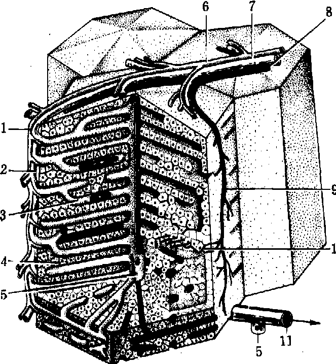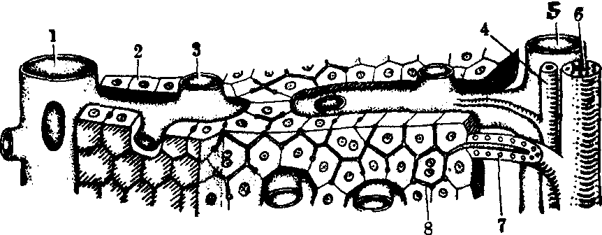 图3 肝板与肝血窦立体模式图 1.中央静脉 2.肝板 3.肝血窦 4.小叶间动脉 5.小叶间静脉 6.小叶间胆管 7.Hering管 8.胆小管 肝细胞是肝实质的细胞,约占肝小叶体积的70~80%,是实现肝功能的主要细胞。肝细胞呈多面形,至少有两个面与血窦相邻,其余的面与相邻肝细胞连接。肝细胞之间有胆小管,故每个肝细胞有三种连接面:血窦面、胆小管面和肝细胞连接面。血窦面与胆小管面有微绒毛,肝细胞连接面有紧密连接、中间连接、桥粒和缝隙连接(图5)。血窦面约占细胞表面积的35%,胆小管面约占10%,肝细胞连接面约为55%。血窦面微绒毛多,使表面积增大6倍左右,有利于肝细胞从窦周间隙摄取物质或排出细胞产物(参见“肝细胞”条)。 胆小管是相邻肝细胞连接面局部凹陷形成的细管,位于肝板内并互相通连成网。管径细,直径约0.5~1μm,常规染色切片中不易辨认,以浸银法或碱性磷酸酶显示法能清楚显示(图6)。电镜下,见肝细胞的胆小管面有许多微绒毛伸入腔内,胆小管附近的肝细胞膜形成连接复合体,封闭管腔,使胆汁不致外溢到肝细胞间和窦周间隙(图5)。但肝细胞连接处仍具有一定的通透性,在慢性胆道阻塞时,胆汁中的某些成分可通过细胞连接进入窦周间隙。胆小管周围约2~3μm厚的肝细胞胞质内,高尔基复合体、溶酶体和微丝较发达,与胆汁分泌功能关系密切。其他细胞器较少。微丝深入微绒毛内,并与附近连接复合体的微丝相连接,有支持和加强胆小管的作用。微丝的收缩作用,可调节胆小管的口径和胆汁的流动。若破坏微丝,可致胆汁排出障碍。