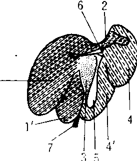 猪肝的分叶 1.左叶 1′. 左内叶 2. 尾叶 3. 方叶 4. 右叶 4′. 右内叶 5. 胆囊 6. 门静脉 7.肝圆韧带 肝1. 五脏之一。主要功能有: 肝成人男性肝的重量为1230~1450 g,女性1100~1300 g,相当于体重的1/50~1/36。胎儿和新生儿的肝相对较大,重量可达体重的1/20~1/16。肝的绝对重量以26~40岁者最重,以后逐渐减轻。中国人肝的大小约25 cm×15 cm×16 cm。肝的上界在右侧锁骨中线平第5肋或第5肋间,肝下缘居剑突下约3 cm。因此成人在右肋弓下缘不应触到肝。肝的脏面借H形沟分为4叶,有4套管道,形成2个系统。 肝liver系位于右上腹部,呈楔形的,人体中最大的腺体。有分泌胆汁、造血、新陈代谢等十分复杂的功能。成人肝约重1 500g,小儿肝脏相对较大、初生儿更大些。肝在活体呈红褐色,质软;分上、下两面,前、后、左、右4缘,肝的前缘锐利,在胆囊窝处有胆囊切迹,在脐静脉索通过处有脐切迹;后缘钝圆,对向脊柱;左侧缘锐利;右侧缘稍圆钝。肝的上面凸隆与膈相贴,借肝镰状韧带,将肝分为左、右两叶,右叶大而厚,左叶小而薄。肝的下面凹陷,有2条纵沟和1条横沟,呈“H”形,右侧纵沟前方为胆囊窝,容纳胆囊,后下方有下腔静脉,左侧纵沟前方有肝圆韧带,后方有静脉韧带,横沟为肝门处。肝脏居于右上腹,紧贴膈下,上界右锁骨中线处约为第5肋间隙,下界不超过肋弓缘,肝脏肿大时上界可上升、下界亦可下降,或仅向一个方向胀大。肝脏有动脉、静脉、门静脉3类血管;此外尚有肝胆管系统。肝脏有多种酶,参与机体多种代谢、分解、合成功能。肝脏的疾病亦十分复杂,有炎症、肿瘤、代谢性疾病、免疫性疾病、中毒性疾病及全身多器官、多系统疾病而致并发病等。故肝脏对人体及临床均极为重要。 肝五脏之一。与胆相表里。主要功能是:1.主疏泄。疏,疏通;泄,发泄、升发。指肝气有疏展、升发的功能。表现为调畅气机,促进脾胃的运化功能和调畅情志。如肝失疏泄,肝气郁结,可出现消化不良,抑郁、沉闷等症。2.主藏血。指肝有贮藏血液和调节血量的功能。3.主筋。筋即筋膜。指全身筋膜全赖于肝血的滋养。肝血充盈,才能养筋,以维持筋的正常运动。4.肝气通于目。肝的经脉上联于目系,目的视觉功能有赖于肝气的疏泄和肝血的营养。故有“肝开窍于目”之说。5.肝的经脉为足厥阴经,与足少阳胆经相表里。 肝人体内最大的消化腺。位于膈下,以右上腹为主。分为左右两叶,在肝门处有门静脉、肝动脉和胆总管,入肝与肝实质相通。肝分泌胆汁,参与代谢、解毒和防御功能。肝为实质性脏器,血流丰富,体积大,质脆,故易损伤及出血。 肝gān人和高等动物的消化器官之一。 肝liver是人体最大的消化腺,位于右季肋部和腹上部,分上、下两面和前、后、左、右四缘。上面膈面由镰状韧带分为右大、左小两叶。下面脏面有“H”形沟。横沟为肝门。左纵沟前部有肝圆韧带,后部有静脉韧带。右纵沟前部为胆囊窝,后部有腔静脉沟。肝下面借左纵沟分为左、右两叶,右叶又被肝门和右纵沟分为方叶、尾状叶和狭义的右叶。肝前缘左部有脐切迹,右部有胆囊切迹。肝表面被一层纤维囊包绕,在肝门处随门静脉、肝动脉、肝管和神经进入肝内,形成格利逊系统的各级分支及其分布区,将肝分为五叶六段。 肝ɡān❶五脏之一。居胁下, 其经脉布于两胁, 与足少阳胆相为表里。在体合筋, 开窍于目。它的主要功能: 一主藏血。有贮藏和调节血液的功能, 故有“肝主血海” 之说。二主筋的运动。全身筋腱、关节运动,须赖肝的精气滋养, 有“罢极之本” 之称。肝气衰则筋不能动, 肝风内动, 则抽搐震颤。三主疏泄。能助脾胃消食运化。其气升发, 能舒畅气机。肝气郁结, 则气郁易怒,不思饮食。四主谋虑。肝与精神活动有关,肝病多急躁善怒, 急躁善怒则谋虑不周。 肝 肝肝是人体最大的腺体,具有分泌胆汁、储存糖元及解毒等重要功能。肝的大部分位于右季肋部和腹上部,小部分位于左季肋部。中国成年人肝的重量,男性为1230~1446.7g,女性为1100~1300g,男女相差为130~145g,以26~40岁时的肝为最重,此后逐渐减轻。成年人肝约占体重的1/36,胎儿与新生儿的肝脏相对地较大,约占体重的1/16~1/20。肝的血液供应丰富,色泽红褐,质地柔脆,故创伤时可导致大量出血,作手术缝合时不宜太紧。