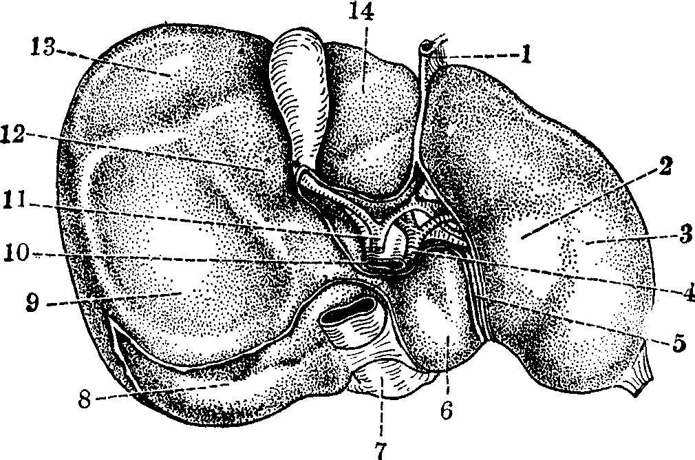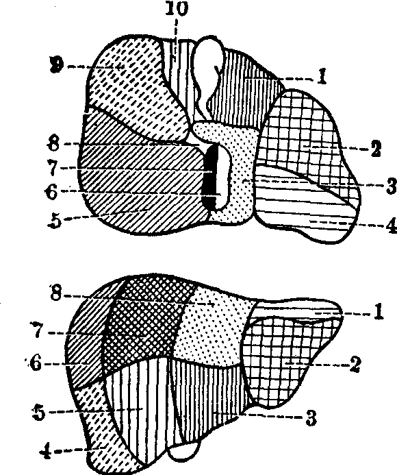 图1 肝的脏面 肝的毗邻 肝上面与膈穹窿和腹前壁相接,上部隔着膈与右侧膈胸膜、右肺底、心包、心室及小部分左侧膈胸膜以及左肺底相邻。肝脓肿或囊肿溃破后,可能穿过膈和右侧胸膜而达右肺。前部的大部分与膈相接,隔着膈,右侧分与胸膜及第6~10肋相对;左侧分与第7~8肋软骨相对;其正中部隔着腹膜与胸骨剑突和腹前壁相贴。右部与右肺、胸膜及第7~11肋相对。后部与脊柱及食管腹部邻接。肝下面左叶的大部分与胃前壁相邻接,其右侧近肝门处有一呈圆形的网膜结节,与小网膜和胃小弯相触。下邻接胃幽门及十二指肠起始部的是肝方叶。右叶下面前分靠近下缘处邻接结肠右曲,中分近肝门处邻接十二指肠,后分邻接右肾和右肾上腺。 肝的位置因体型、体位、呼吸及内脏活动而有一定范围的变动。在立位及吸气时稍有下降,卧位及呼气时略有上升。处于平静呼吸时,其升降幅度约为2~3cm。女性与小儿肝的位置稍低。 肝的体表投影 肝的上界与膈穹窿一致,在右腋中线起自第7肋,突向左上方,至右锁骨中线平第5~6肋,至前正中线达剑胸结合,在左锁骨中线稍内侧达第5肋间隙。肝的下界与右侧肋弓一致,在右腋中线低达第11肋,沿肋弓下缘至右侧第8~9肋软骨结合处离开肋弓,斜向左上方经左侧第7~8肋软骨结合处与上界左端相接。在前正中线,肝下界位于剑突下方约3cm处,小儿的肝下界比成人的约低2~3cm。肝的体表投影因体型和肝的形状与大小不同而略有差异。 肝的分叶与分段 沿肝膈面镰状韧带的附着线和脏面的左纵沟,将肝分成左叶与右叶(图2);左叶小,约为全肝的1/6,右叶再区分为位于肝门前方的方叶和后方的尾状叶。肝固有动脉和门静脉进入肝内与肝内肝管相伴行,三者与缠绕它们的结缔组织共同构成Glisson系统(彩图3A.B.)。肝外形的分叶与肝内Glisson系统的分支分布并不相符,因而缺少实际意义。自五十年代以来,国内外学者根据大量肝铸形标本的研究,发现肝内有若干“平面”缺少Glisson系统的分布,称这些平面为肝裂,并把它作为肝分叶、分段的自然境界。肝正中裂为一斜位平面,从胆囊窝中点左侧延伸至腔静脉沟左缘,将肝分成大致相等的左半肝与右半肝,或称生理上的肝左叶与肝右叶。尾状叶被肝正中裂分成左、右两半分属左、右半肝。左、右半肝各有一段间裂,左段间裂与左纵沟的平面一致,将左半肝分成内侧段与外侧段。右段间裂是近似水平位的斜裂,相当于右侧第八肋间平面,借以将右半肝分成前内侧的前段与后外侧的后段。不少研究者又根