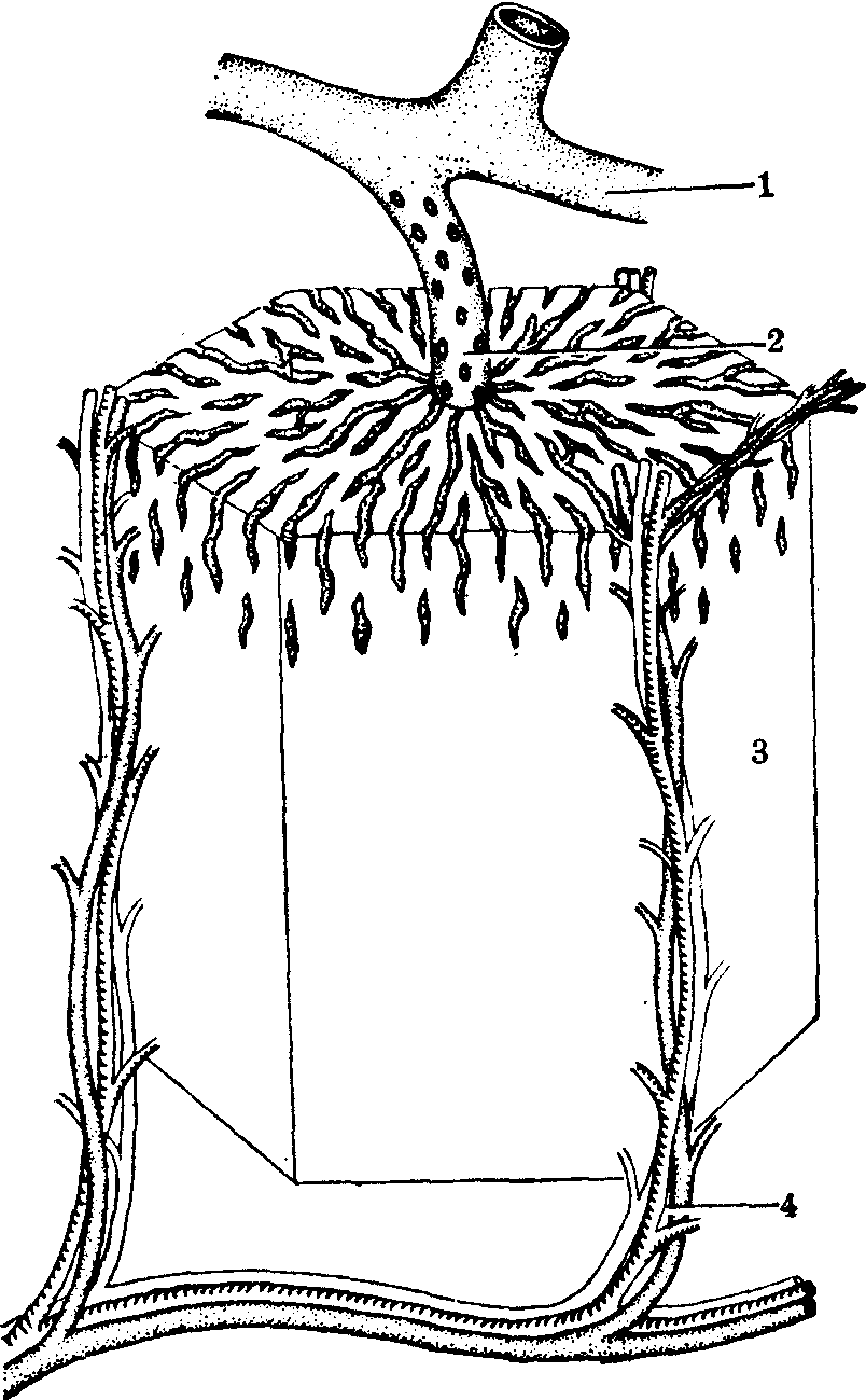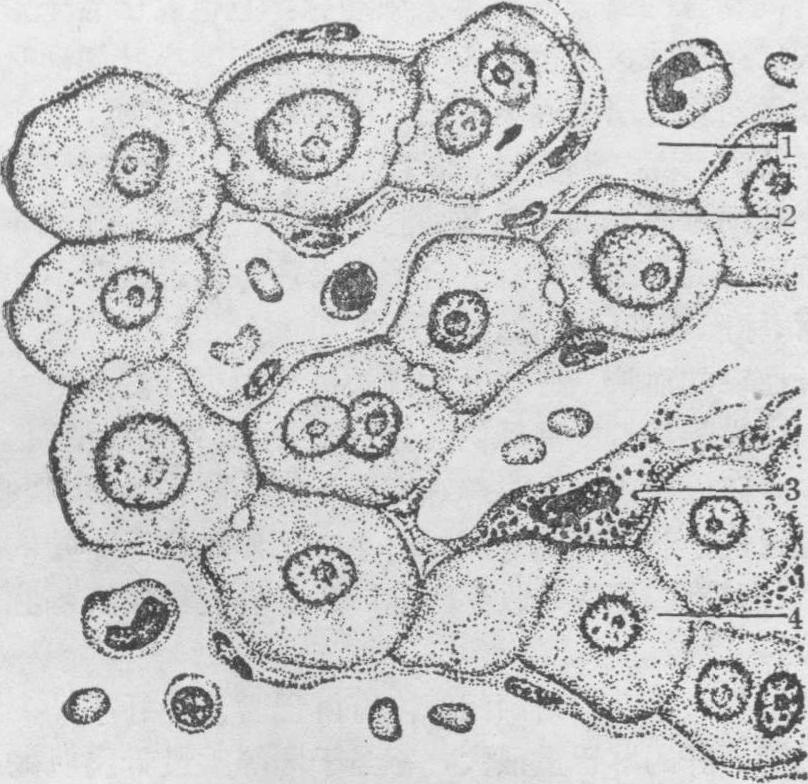 图4 肝索与肝血窦切面图 1.血窦 2.内皮细胞 3.肝巨噬细胞 4.肝细胞