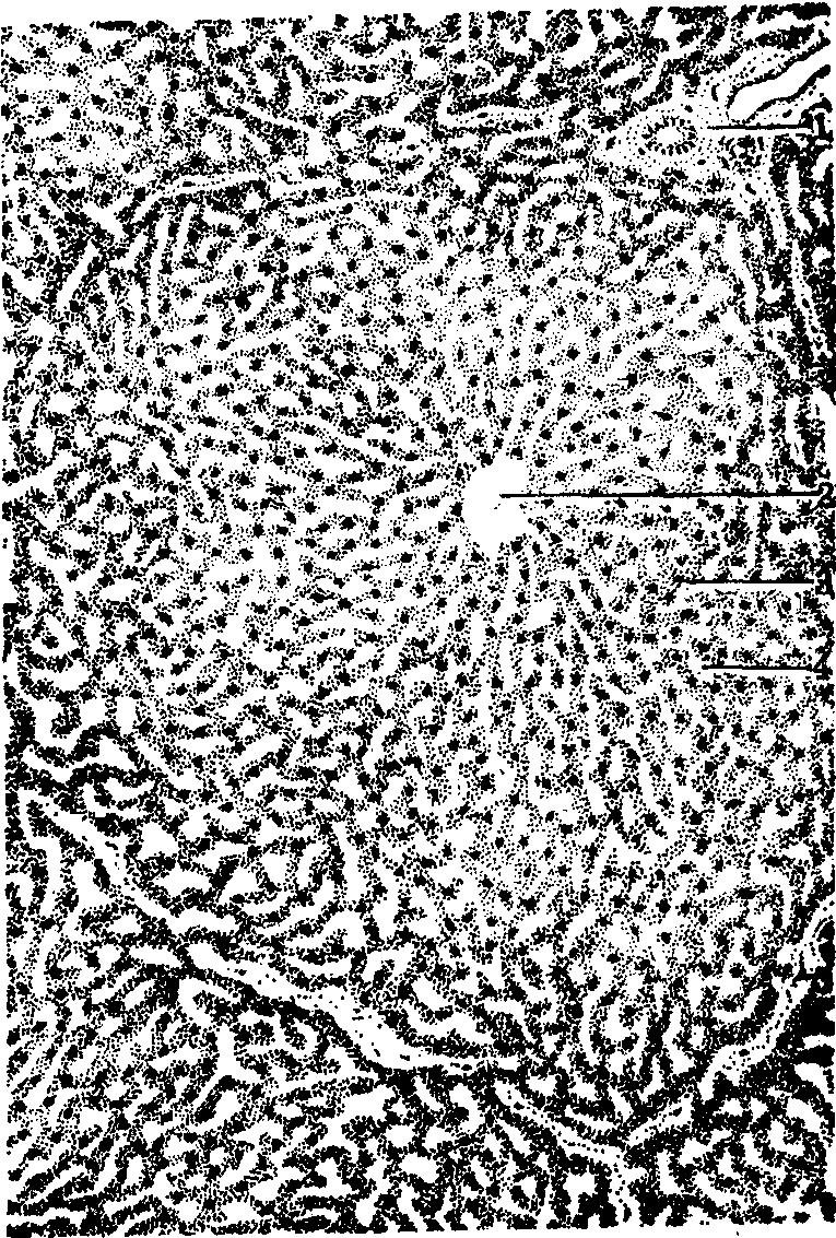 图 1 三种肝单位示意图 经典肝小叶 即一般所称的肝小叶,为多面形的棱柱体,横切面呈多角形,周围有少量结缔组织分隔,血管、淋巴管和胆管分支穿行其中。小叶中央贯穿中央静脉,肝细胞单行排列成肝板分布于中央静脉四周。肝细胞较大,呈多角形,有1~2个大而圆的核,胞质内有丰富的细胞器和包含物。肝板有分支,互相吻合成网,板上还有彼此沟通的孔道,网孔内有窦状毛细血管,称肝血窦(图2)。窦壁有两种细胞,主要是有窗孔的内皮细胞。细胞间有较大间隙,多数哺乳动物内皮细胞外无基膜,只附有少量散在的网状纤维,故通透性较大,有利于血液与肝细胞间进行物质交换; 另一种是巨噬细胞或称枯否氏细胞。体积较大,形状多样,有多个突起,故又称星状细胞。其胞体突入腔内或游离于腔中,以突起附着于内皮细胞上。巨噬细胞对血液中的异物和胃肠来的细菌等有很强的吞噬能力,故有杀菌防病作用。肝细胞与内皮细胞之间有狭小间隙,称窦周间隙或狄斯氏间隙,是肝细胞与血液间进行物质交换的场所。间隙内充满了从肝血窦渗透出来的血浆,一般无红细胞,还有少量散在的网状纤维和贮脂细胞。后者为形状不规则的细胞,具有贮存脂肪和维生素A以及生成结缔组织纤维和基质等作用。肝细胞向窦周间隙的一面伸出许多微绒毛,有扩大肝细胞表面积的作用。
