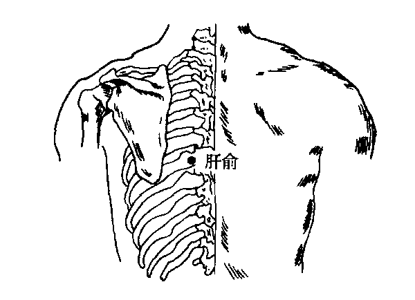 图80 肝俞Kanshu系足太阳膀胱经上的一个针灸穴位。取此穴时俯伏,于第九胸椎棘突下,旁开1.5寸处取之。施针时向椎体斜刺0.7~1.2寸。主治目眩、咯血、黄疸、胸肋痛、鼻衄、夜盲、脊背痛、癔病、精神分裂症等。 肝俞经穴名。属足太阳膀胱经,背俞穴。位于第九胸椎棘突下,旁开1.5寸分处。主治:黄疸,胁痛,吐衄血,目赤,目视不明,眩晕,夜盲,癫痫,脊背痛等。斜刺0.5—0.8寸;可灸。 肝俞ɡānshù经穴名。代号BLl8。出《灵枢·背腧》。属足太阳膀胱经。位于背部, 当第九胸椎棘突下旁开1. 5 寸处。主治黄疸、胸胁痛、吐血、胃脘痛、肝炎、胆囊炎、目昏眩、目赤痛、近视、青光眼、视神经炎、失眠、癫痫、精神病、功能性子宫出血、脊背痛等。微向脊柱斜刺0. 5 ~ 0. 8 寸。禁深刺。灸3 ~7 壮或5 ~15 分钟。