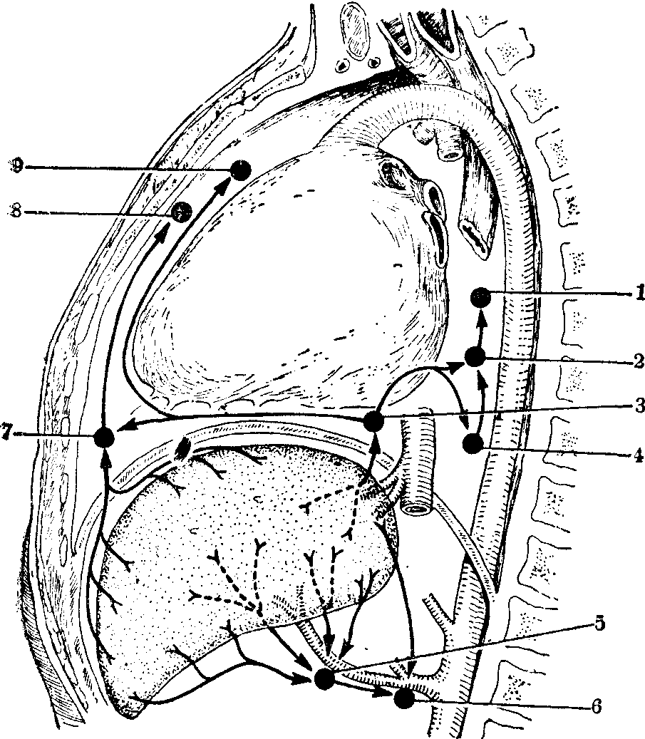 1,2,4.纵隔后淋巴结 3,7.膈上淋巴结 5.肝淋巴结