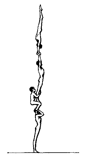 集体项目第1套静力性造型动作之一 。属一人打底的半立柱造型,由于造型架子形似灯笼,故中国俗称“灯笼架”。“下”前后分腿站立,“中1”半蹲站在“下”的肩上,“中2”站于“中1”腿上组成半立柱架,“上”在“中2”的手、头等部位做各种倒立。这种造型与肩上立柱架造型相比,难度较低。但由于半立柱架重心较低,“上”较易在架上完成一系列高难度过渡动作,故往往能以“稳”、以“上”的动作难度取胜。例如:1978年由上海队首次采用“灯笼架高双臂倒立”在中国国内比赛中夺冠。而当时颇有声誉的安徽队因肩上立柱头上单臂倒立不稳而败北;又如在国际比赛中,中国选手多次采用灯笼倒立过渡动作,以稳、难而夺冠。当前男四项目第1套动作造型的发展趋势是造型架子的变化。较多采用“由肩上立柱过渡到肩上半立柱”或“由肩上半立柱过渡到肩上立柱”的变化形式,因此肩上半立柱倒立造型在第1套造型动作中占有重要地位。完成方法:“中1”与“下”对面站立交叉握,“中1”在“下”拉引帮助下,用左脚蹬“下”左腿向上跳起,同时向左转体180°,两脚分别踩在“下”的双肩上,然后“下”直立,用双手扶持“中1”小腿,成双人立柱;“中2”于双人立柱前与之同向站立,两臂上举,“中1”半蹲,两手握“中2”手,协助“中2”向上跳起,两手经侧成支撑,两脚站于“中1”腿上,随之,“中1”两手换扶“中2”双膝,组成肩上半立柱架;“上”面对半立柱架,两手扶“中1”脚,脚踩“下”腿上爬站至“中1”手腕上,随之一手撑“中2”头,一手撑“中2”手,“中2”把“上”托转180°站肩,然后,“上”在“中2”的手上或头上完成各种倒立;动作完成后,“上”向前方跳下,接着“中2”、“中1”依次向前方跳下。练习方法:上3节马步半立柱组架练习;下3节肩上半立柱组架练习;四人组架练习;压架练习;完整练习。注意:练习时,“中2”、“中1”不宜距离过大;由于架子高度增加,上架练习时“上”应用保护带。
