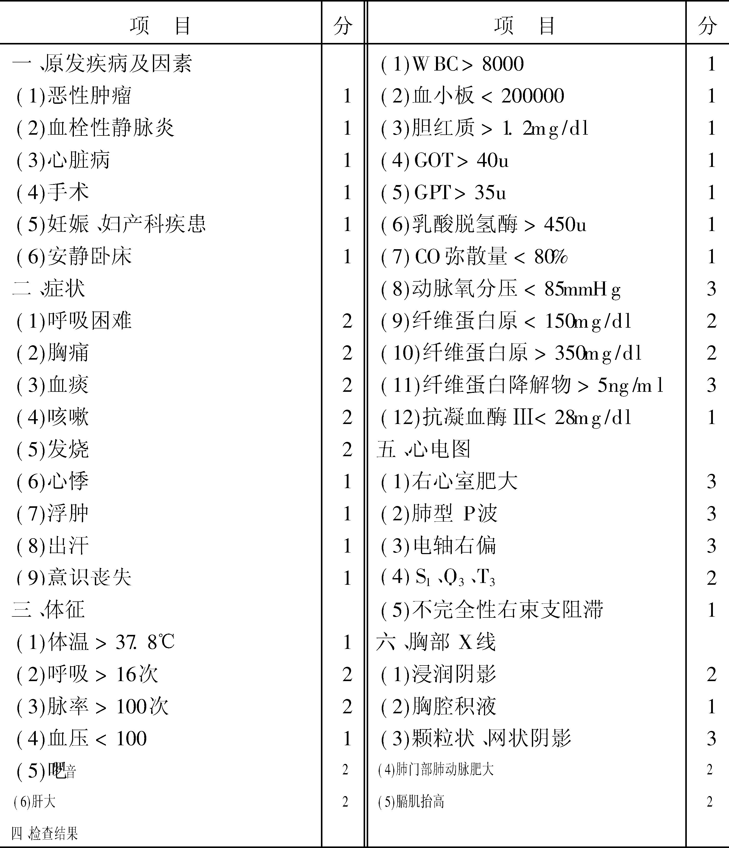 | 释义 | 肺血栓栓塞症 肺血栓栓塞症pulmonary thrombolism,PTE村尾诚等提出的肺血栓栓塞症的判断标准见下表。 肺血栓栓塞症评分判断 判断:1.22分以上大体可以确诊;2.20分以上极为可疑;3.17~19分可疑;4.15~16分时必须进行下两项检查:(1)肺血流灌注及肺雾化吸入扫描; ❶肺灌注扫描呈区域性缺损; ❷雾化吸入扫描正常; ❸以上两项均检查。(2)肺血管造影: ❶血管阻塞征; ❷血管呈充盈缺损。 ☚ 脂肪栓塞综合征 肺不张 ☛ |