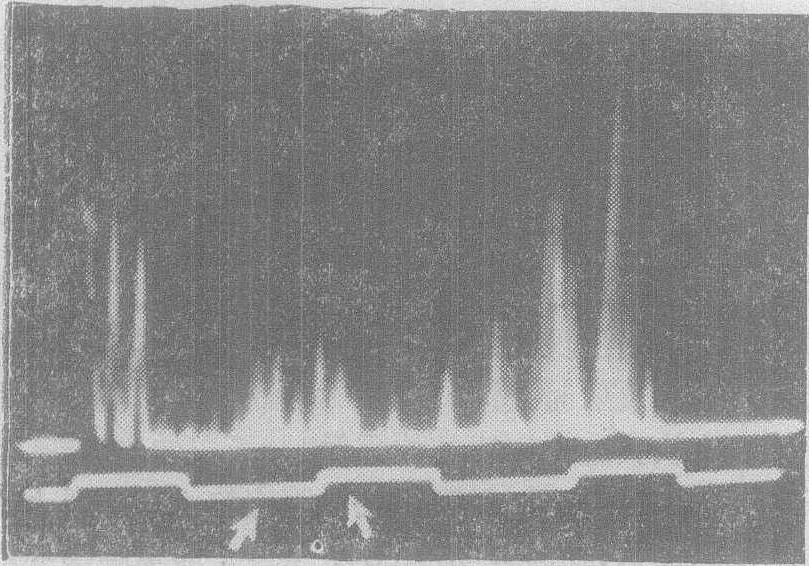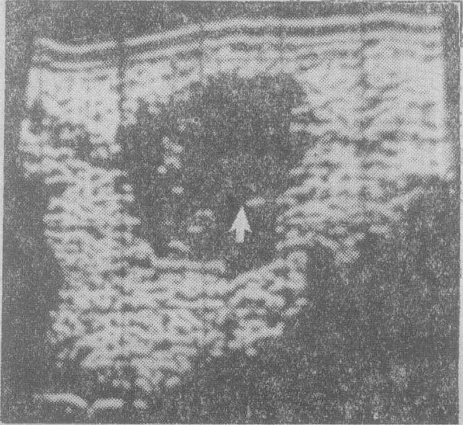 图5 子宫肌瘤声象图(箭头示肌瘤) 卵巢肿瘤 超声探测对卵巢单纯性、多发性和子宫内膜囊肿有肯定的诊断价值。囊性畸胎瘤存在实体和囊性部分,特别当出现毛发团的强烈回声或随体位改变的线状水平界面反射时,诊断较易。对囊腺瘤,如能探测到房隔及乳头状突起的实质结构反射时,可以做出诊断,但难于区分是否恶变。卵巢囊腺癌和腺癌等由于出现大片强烈不规则反射,诊断较易(图6)。总之,卵巢肿瘤的囊壁和房隔薄而光滑,有液性暗区或均匀细弱回声者,多为良性;囊壁和房隔厚而不规则,肿块区充满强烈不规则回声者,则多属恶性。超声探测对于浆膜下子宫肌瘤和卵巢实体瘤,卵巢囊肿和输卵管积水的鉴别尚有困难,但对于某些高张力临床上不易与实体瘤鉴别的卵巢囊肿,以及巨大卵巢囊肿与大量腹水的鉴别(表4),超声诊断有很大作用。