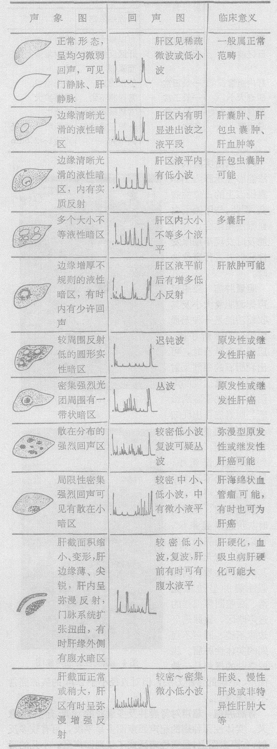 图2 原发性肝癌回声图(箭头示丛波) 表2 超声探测对肝癌和肝脏其他疾病的鉴别诊断及临床意义