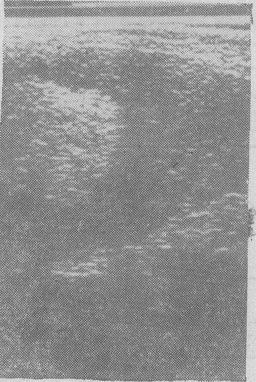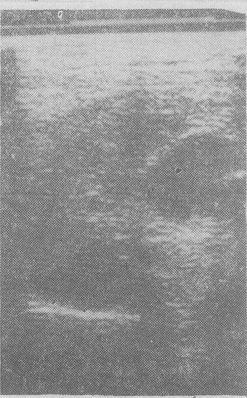 图1 左眼成视网膜细胞瘤的声象图左侧箭头示右正常眼及晶状体,右侧箭头示左成视网膜细胞瘤,肿瘤位于颞侧 甲状腺肿瘤 用直接探测或间接的间隔连续显象法,在灰阶超声图上出现甲状腺弥漫肿大或局限性肿大,前者常属于结节性甲状腺肿或甲状腺炎,后者则多为肿瘤。应用超声探测能鉴别肿瘤属于囊肿性、实体性或混合性。甲状腺囊肿呈现一个边缘清楚的透声暗区; 甲状腺炎伴有水肿时,呈均匀性肿大,轮廓清楚;实体性肿瘤,如呈现均匀性细小回声,多属良性,如呈现强烈不规则反射或肿瘤后壁模糊不清时,则提示有恶性可能。结合放射性核素扫描能提高诊断的准确性。通过连续切面象,可测定其体积。 乳腺肿瘤 应用5兆赫频率以上超声灰阶显象仪能显示乳腺囊性增生病、囊肿、纤维腺瘤、乳腺癌等的不同图象。乳腺囊肿的边缘清晰,中间为透声暗区;纤维腺瘤的边缘光滑,后壁清晰,多为均匀细小反射,或为实性暗区;乳腺癌则呈现强烈的不规则回声,边缘不整齐,底部回声减弱或有缺损。因而应用超声鉴别乳腺囊肿与实体瘤有较大价值,但在鉴别良恶性方面还不够满意。 肺及纵隔肿瘤 虽然由于肺泡内含有空气,超声难以穿透,因而超声对肺部肿瘤的诊断价值不大。只有当肿瘤靠近胸壁,在肿瘤与胸壁间的肺组织实变或充满炎性渗出时,超声才有可能探测到。当这类肿瘤不能得到痰液脱落细胞阳性诊断时,可通过超声定位后再行穿刺,常能获得满意的病理诊断。纵隔肿瘤亦由于解剖部位的关系,只有当其位于前上纵隔时,如胸骨后甲状腺肿瘤、胸腺瘤、淋巴瘤、畸胎瘤等,超声探测有可能获得肿瘤图象并有助于诊断和鉴别诊断。 肝脏肿瘤 由于肝脏是一个实体器官,于正常灵敏度下探测时,常呈现均匀结构。自采用灰阶扫描和实时成象后,对肝脏可以进行动态观察,容易发现肝实体的异常改变,还可以观察肝静脉、门静脉和肝外胆管的走向、粗细、压挤、变形、扭曲等,对肝癌的早期诊断和定位有较大帮助。应用超声探测以鉴别肝囊肿、多囊肝和肝癌具有一定作用,能迅速反映液性区域,易与实体性肿瘤相鉴别。如为肝癌,超声探测能反映其占位病变所在及其对脉管的挤压现象。在回声图上,肿瘤区常可呈现丛波或迟钝波(图2);声象图上,可呈现不规则强烈光团,其周围常有一圈带状暗区(图3),也可为实性暗区(图4),或全肝呈不规则分布的较强的异常反射,有助于与其他肝脏疾患的鉴别诊断(表2)。此外,超声对于黄疸的鉴别诊断也有作用(表3)。 对核素扫描出现肝区放射性缺损或分布稀疏的病例,超声探测能确定该区域为液性占位、实体占位或是由于肝萎缩的肝下缘上移所引起,并能描绘出肝脏下缘从而获得鉴别诊断。通过超声探测绘出肝脏及肝内肿瘤的体表投影,有可能确定肿瘤的部位、大小和数目,有助临床治疗前的参考,也可作为放射治疗时放射野的设计定位和计算照射剂量。