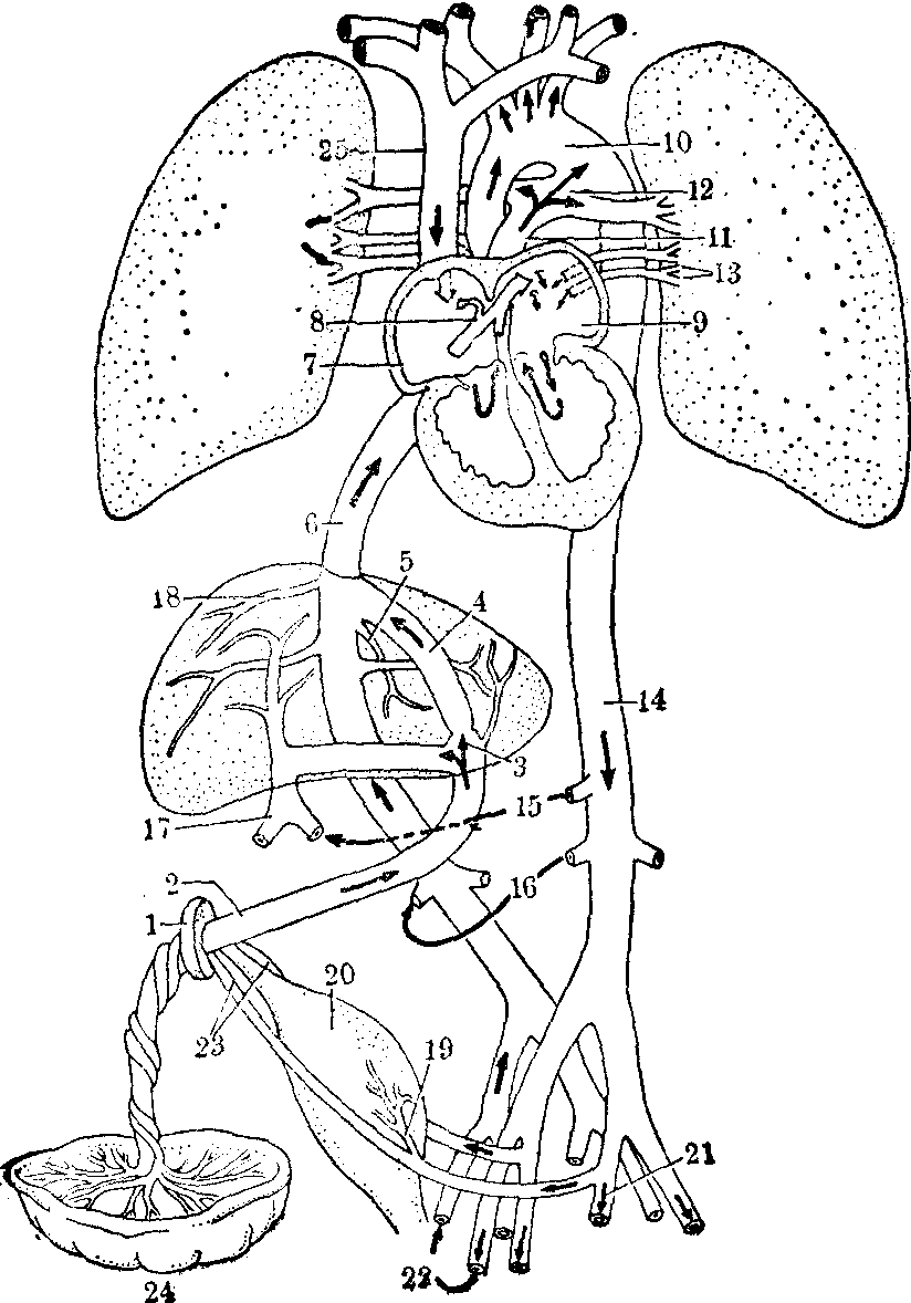 图1 胎儿血液循环 1.脐 2.脐静脉 3.静脉导管括约肌 4.静脉导管 5.左肝静脉 6.下腔静脉 7.右心房 8.卵圆孔9.左心房 10.主动脉弓 11.肺动脉干 12.动脉导管 13.肺静脉 14.降主动脉 15.肠系膜上动脉 16.肾动脉 17.门静脉 18.右肝静脉 19.膀胱上动脉 20.膀胱 21.髂内动脉 22.髂外动脉 23.脐动脉 24.胎盘 25.上腔静脉 胎儿血循环途径