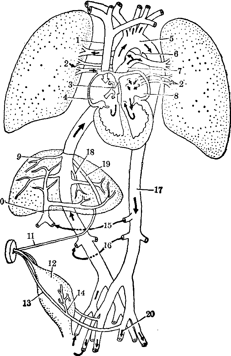 图2 出生后血液循环的改变 1.上腔静脉 2.肺静脉 3.卵圆孔已闭 4.右心房 5.主动脉弓 6.动脉韧带 7.肺动脉干 8.左心房 9.右肝静脉 10.门静脉 11.圆韧带 12.膀胱 13.脐侧韧带 14.膀胱上动脉 15.肠系膜上动脉 16.肾动脉 17.降主动脉 18.左肝静脉 19.静脉韧带 20.髂内动脉 ☚ 心脏与血管畸形 淋巴系统的发生 ☛ |