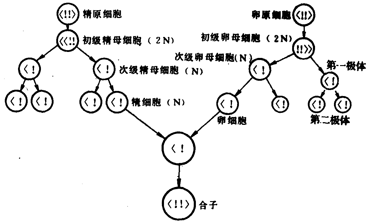 昆虫精子及卵子形成与受精示意图 精子形成 精原细胞在睾丸中分裂增殖,达到一定数量后,进入成熟期,称为精母细胞,它们连续进行两次成熟分裂。第一次成熟分裂的精母细胞为初级精母细胞,一个初级精母细胞完成第一次分裂之后,产生两个次级精母细胞,再由这两个次级精母细胞进行第二次成熟分裂,产生4个精细胞。这是包括昆虫在内的一般动物精子形成的过程,其初级精母细胞的染色体数目与体细胞的染色体数目相同,为二倍数(diploid, 2N)。经第一次成熟分裂产生的次级精母细胞,其染色体数减半,成为单倍数(haploid, N)。第二次成熟分裂与普通细胞有丝分裂一样,产生的两个精细胞染色体数目与次级精母细胞的相同,即具有单倍数染色体的精细胞。 蜜蜂的雄蜂本身就是单倍体,其精原细胞和初级精母细胞的染色体数目也都是单倍数,它们的初级精母细胞的两次分裂无减数分裂,均为有丝分裂,染色体数目不减半,仍保持16个染色体。巴西W. E.克尔(1974)等人通过组织切片和镜检观察到,每一精母细胞产生两个精细胞,将发育成两个精子。 授精和受精 处女王羽化后5~7日性成熟,就可飞出巢外与雄蜂交配(见婚飞)。交配时,雄蜂将阳茎插入处女王生殖腔,注入精液,精子贮存于蜂王受精囊内。蜂王接受精子后经数日即开始产卵。蜂王产卵时,卵从卵巢管向下移,经侧输卵管到达中输卵管,当卵经过受精囊开口处时,如释出精液,精子由卵孔进入卵内,在卵内受精。卵子在卵巢管内发育完成后准备产卵以前,卵细胞核开始第一次成熟分裂,在分裂进入细胞分裂中期(metaphase)时暂停,等精子进入卵内后,继续进行分裂。完成第二次成熟分裂时,产生一个具有半数染色体的卵原核和3个极体,这些极体不久即行消失,继而卵原核与精子结合成为合子。受精卵是含有16个染色体的精子与也含有16个染色体的卵核结合,结果就含有32个染色体,将发育为雌性蜜蜂。另一方面,一个未受精卵在核中只有16个染色体,只能发育为雄蜂。 胚前发育见个体发育。 |
