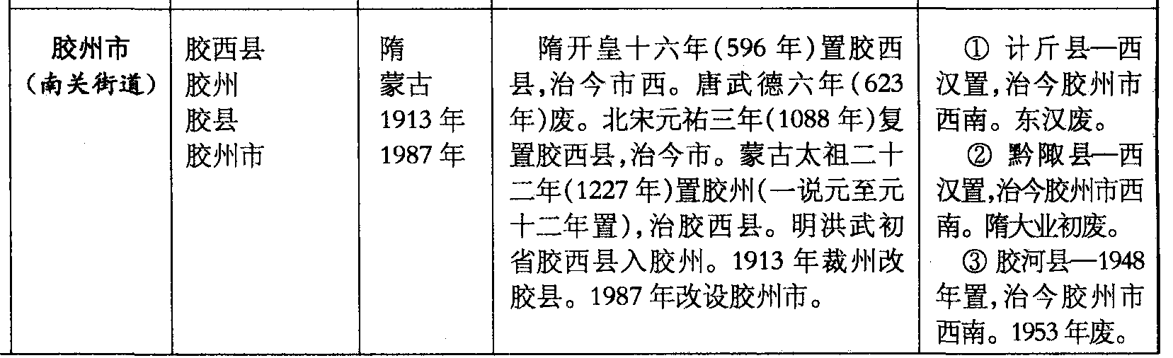 胶州市(南关街道)胶西县胶州胶县胶州市隋蒙古1913年1987年隋开皇十六年(596年)置胶西县,治今市西。唐武德六年(623年)废。北宋元祐三年(1088年)复置胶西县,治今市。蒙古太祖二十二年(1227年)置胶州(一说元至元十二年置),治胶西县。明洪武初省胶西县入胶州。1913年裁州改胶县。1987年改设胶州市。❶ 计斤县—西汉置,治今胶州市西南。东汉废。❷ 黔陬县—西汉置,治今胶州市西南。隋大业初废。❸胶河县—1948年置,治今胶州市西南。1953年废。