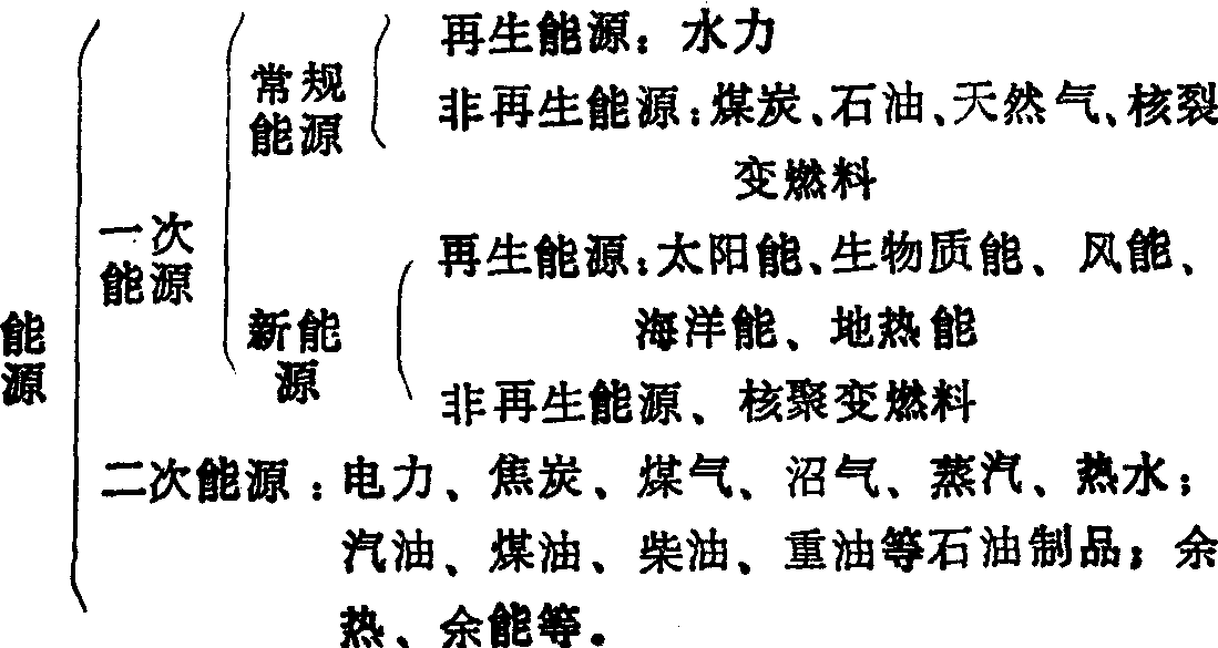 能源见“能源”中的“能源”。 能源供人类生产生活利用的某些自然资源和通过加工所获取的再生能源的统称。如石油、煤炭天然气、水等属于自然资源范畴的能源。开发太阳能等获取的属于再生能源。 能源 能源能源指提供热、光和动力能量的源泉。能源已从人力和畜力演变到矿物燃料、铀、水能、风能以及太阳能。工业时代是建立在矿物燃料代替人力和畜力的基础上的。今后随着矿物燃料的枯竭,必须增加太阳能和核能的利用。 主要的矿物燃料是煤、褐煤、泥煤、石油和天然气——所有这些都是在百万年以前形成的,它的数量是有限的,其他矿物燃料的潜在来源是油页岩和焦油砂。非燃料能源包括垃圾、水能、风能、地热能、生物质能以及太阳能。在目前非燃料能源可提供的能量很小,但是随着矿物燃料的耗尽,非燃料能源、裂变和聚变能源变得更加重要,因为它们是可再生的。由铀、钍和钚的裂变产生的核能,以及由两个轻原子如氘、氚或氦—3的强制聚合产生的聚变能,在21世纪可能变为更重要的能源。 由于世界更加工业化,所以产生动力和能量的燃料消耗已经迅速增加。全世界能源的消耗在1961年是139×1018焦,而到1972年已增加到251×1018焦,平均年增长率为5.5%。在这一时期,人口及实际的国民经济总产值分别以 1.9%和5.1%的速率在增加。1973年阿拉伯国家石油禁运,以及紧接着的石油价格上涨3倍,使全世界陷入经济混乱之中,工业增长速度急剧下降。 能源已成为人类社会发展不可缺少的血脉,但能源资源的有限为人们提出许多问题。目前矿物燃料仍是能源消费的主体,但现有资源已不足以为今后的工业发展提供可靠的保证。寻找新的能源形式以及利用方式成为能源科学的主要课题。 核能已日益发展成能源领域中的不可缺少的部分,但铀的储量又限制了核电站发展。最大限度利用潜在的核能燃料将需要发展增殖反应堆,现在有两种不同形式的增殖反应堆正在研究: 热增殖和快速增殖。 聚变能有可能成为未来的主要能源。聚变过程的原理是,当两个轻原子核被强制结合成一个或两个较小质量的原子核时,能量便释放出来。聚变反应堆中的主要燃料是气态的氘、氚及氦—3,当用于聚变反应堆时,海水中氘的数量将给全世界提供取之不尽的能量。 油页岩、焦油砂也成为一大能源支柱,焦油砂是世界最大的液态碳氢化合物资源。太阳能一直是一种潜在的、无限的和清洁的能源,然而太阳能的开发一直很慢,原因是需要储存以及需要较高的投资成本。现在随着世界上石油和天然气的价格突然大幅度上涨,太阳能的经济性,尤其是在低水平加热和冷却方面,已达到商业应用方面具有经济效果的阶段。同时地热量也是相当巨大的,具有很大的开发潜力,也是一种可再生的能源。 风能、潮汐能、生物质能以及垃圾均可成为替代能源。通过在能源开发上的多样化、多层次的努力,可以解决或部分解决能源紧缺。 ☚ 能源资源 能源分类 ☛ 能源 能源蕴藏能量的自然资源。在自然界中,有许多自然资源蕴藏有某种形式的能量。例如,光芒四射的太阳蕴藏有太阳能;奔腾的江河具有势能和动能;煤炭蕴藏有热能等等。人们可以利用它们,将这些能源开发或转换成人们所需要的电能、热能、机械能等。这些蕴藏能量的自然资源是发展国民经济的基础,是人类生活的基本条件。目前各个国家大量开发利用的能源有煤炭、石油、天然气、铀、太阳能、江河水力等。 ☚ 能源科学技术 一次能源 ☛ 能源Energy提供人类所需要的热、电、光、磁、声和生物、化学、机械等能量的物质的总称。在自然界,可被利用的能源种类很多,按不同的标准可以分为一次能源和二次能源,常规能源和新能源,再生能源和非再生能源。已存在于自然界,无需进行加工、转换即可直接使用的能源称做一次能源,如煤炭、石油、天然气、核能、风能、水能、太阳能、地热等。将一次能源进行加工、转换而得到的能源称二次能源,如焦炭、煤气、电力、沼气、酒精,以及生产中排出的可燃废气等。已被人们广泛使用的能源称做常规能源,如煤炭、石油、天然气、水力等。实践早已证明可开发利用,但目前因技术等原因没有被广泛利用的能源称做新能源,如太阳能、风能、海洋能、生物质能、地热、氢能等。存在于自然界中的能源,有一部分能够不断再生,不随人类开发使用而减少,这部分能源称做再生能源,如水能、太阳能、风能等。经过人类开采使用而无法再生的能源称做非再生能源,如煤炭、石油、天然气等。新能源和再生能源是无公害、无污染的能源,不少国家都在开发利用。随着科学技术的发展,估计到21世纪这种能源将被广泛使用,成为人类未来的常规能源。 能源指能够转换成为机械能、热能、电能、化学能等各种能量的自然资源。它是发展农业、工业、国防、科学技术和提高人民生活的物质基础。 按照来源,能源可分为三大类:第一类是来自太阳的能量、包括直接由太阳辐射所产生的光能、热能和间接来自太阳的能量。后者指煤炭、石油、天然气等矿物燃料,以及风能、水能和海洋能等。第二类是地下热水、地下蒸汽、干热岩体等地热能和地下储藏的核燃料,如铀、钍等物质在进行原子核反应时所释放出来的能量。第三类是太阳和月球等对地球的相互引力产生的能量,如海水涨落而形成