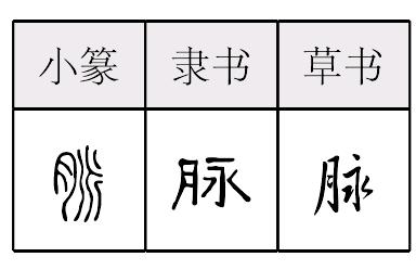脈,表意,从月(肉)从.jpg) 为水的支流,本义读mài,人体内流动的血脉,即血管。变体作“脉”。引申为脉搏(心脏收缩时,血液冲击引起的动脉的跳动)、类似血管的组织或成系统的东西等。又读mò,用于“脉脉”,眼神中深含情意的样子。《异体字表》以“脈”为异体字。 【辨析】 ❶“脉”与“脈”不是等义异体字。 ❷脉/派 见303页“派”。 【构词】 脉络(脈絡)∣动脉(動脈)∣山脉(山脈)∣含情脉脉(含情脈脈)脉 *脈; 篆 隶mài【析形】会意字。小篆字形从肉、从 。肉与人体有关, 与永为一字分化,本义是水网径流。隶书字形变后肉旁多讹变成月,从肉、从永。 【释义】《说文》:“ ,血理分衺行体者。脉, 或从肉。”本义是人体的血管,又指脉搏。引申为事物如血管连贯有条理者,又指血统、宗派等相承的系统。[一脉相传]谓一个血统或派系世代相续流传下来,常比喻某种思想、学说或行为之间的继承关系。 【shape analysis】It is the associative character.In Small Seal script it is related to 肉(ròu,body)plus .肉 is relative to a human body. and 永(yǒng)are divisions of the same character,originally meaning the runoffs of water network.The character ofter Official script is related to 肉 in meaning and sounds like the pronunciation of 永. 【original meaning】The vessels of a human body and also pulse. |