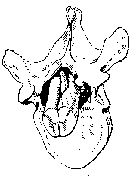 脊髓先天畸形有: 脊髓脊膜膨出(参见“脊柱裂” 条),脊髓裂和双干脊髓脊髓裂(图1)和双干脊髓(图2)是两种在形态学上有某些类似的脊髓先天畸形。前者可能与脊索发育异常有关,后者可能是一种躯干双畸胎畸形未能形成的部分表现。在脊髓裂时有一条骨梁发自椎体背面,穿过硬脊膜到达椎管背侧,将脊髓或马尾分割成左右两半。这种畸形多发生于胸或腰下部,常与脊椎畸形,特别是隐性脊柱裂伴发。由于骨梁的存在,当身长增加时则使脊髓或马尾被牵张,产生腰骶髓或马尾症状。在X线摄片检查时,可在脊椎背侧发现上述的骨梁,在脊髓腔造影时,可见脊髓中央有一特殊的充盈缺损影。治疗方法是: 如未合并脊柱裂,在病变区域行椎板切除术,切除骨梁及其周围的硬脊膜和结缔组织,缝合硬脊膜。如尚有骨质不便从硬脊膜内切除,可再从硬脊膜外切除。
