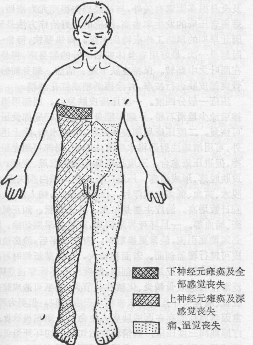 图2 Brown-Sequard综合征示胸髓右半侧横断所产生的运动和感觉丧失的范围 脊髓不全挫裂性损伤 布朗、塞卡尔综合征(Brown-Sequard综合征)。多发生在颈髓或上部胸髓。伤侧平面为下神经元瘫痪及各种感觉丧失。对侧痛、温觉丧失(图2)。因刀刺伤者,症状比较整齐、典型,因脊柱骨折脱位所造成的半侧损伤典型者少,多数仅系伤侧肌肉瘫痪较重,痛、温觉较好,对侧肌肉瘫痪较轻,但痛温觉丧失较多而已。如半侧损伤发生在脊髓圆锥或马尾,则运动和感觉丧失都只限于伤侧。