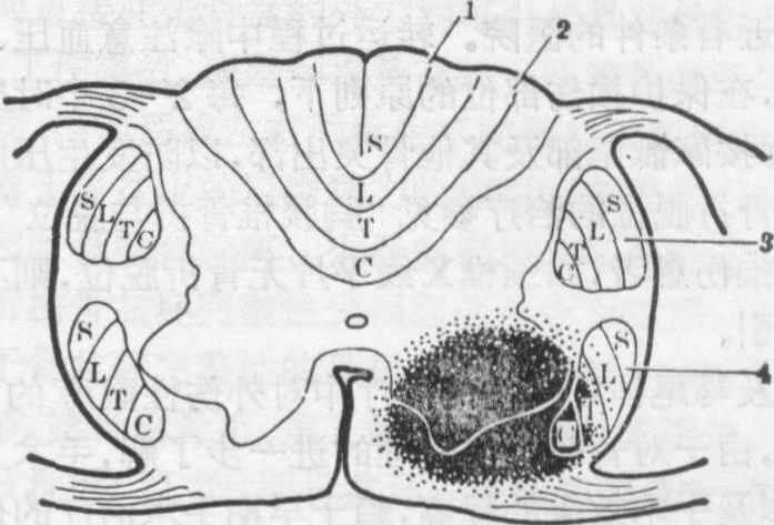 图4 脊髓前角损伤的横切面图 1.薄束 2. 楔状束 3.皮质脊髓侧束 4. 脊髓丘脑侧束 脊髓前部综合征 脊髓前半部损伤常累及脊髓前角、侧角、前束及侧束,甚至也可累及部分后束。临床上表现为损伤平面以下运动、痛、温觉,大小便功能、血管舒缩功能部分或全部丧失,唯后束功能大部或全部保留,脊髓前部综合征的产生可能与下列因素有关: ❶椎体后缘直接压迫脊髓前部; ❷脊髓前部血管损伤; ❸脊髓后束纤维粗大,对外伤有较强的抵抗力。 脊髓中央综合征 脊髓灰质血运丰富,对损伤敏感,因而脊髓挫伤后易发生中央出血性坏死,临床多见于颈髓损伤,其特点为近端(上肢)瘫痪较重,而远端(下肢)瘫痪较轻(图3)。因在皮质脊髓侧束中到颈髓或胸髓去的纤维靠近脊髓中央,故受伤较重,而到腰髓或骶髓去的纤维靠外,故损伤较轻。 脊髓前角或前根损伤 前角损伤多因前角内出血或空洞形成所致,可为单侧或双侧,可累及几个节段(图4)。临床表现仅为受累肌群呈弛缓性瘫痪。单纯神经根损伤较少,好发于单侧,累及范围较小。前根损伤后,神经膜套撕脱,脑脊液漏出,局部可形成囊袋状,碘剂造影可进入囊内,借此可与前角损伤鉴别。 ☚ 脊髓压迫 马尾神经损伤 ☛ |