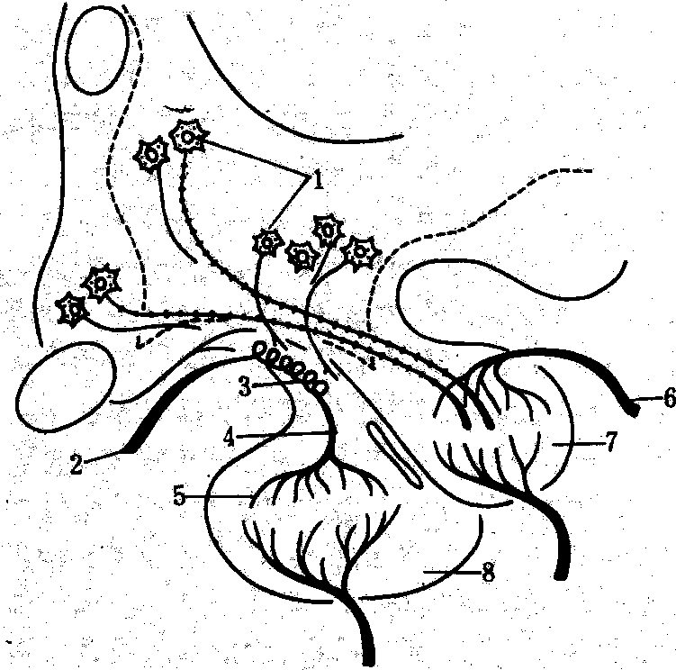 图2 腺垂体细胞超微结构模式图 1.促生长激素细胞 2.催乳激素细胞 3.促性腺激素细胞 4.促甲状腺激素细胞 5.毛细血管 嗜碱细胞不易被苏木精染色,在普通染色切片中不易辨认,但易被安尼林蓝染色,PAS反应阳性。它们比嗜酸细胞大,卵圆或多角形,多分布于前叶的中心和前部(彩图4),可分三种: ❶促甲状腺激素细胞:又称β2细胞,较大,呈多角形,常成群。胞质含许多小而致密的分泌颗粒,直径100~150nm,位于胞质外周部(图2)。动物实验表明,切除甲状腺可使此种细胞增多和肥大;注射甲状腺素,可致它们萎缩。免疫细胞化学法已定位促甲状腺激素于此种细胞。此激素为糖蛋白,它维持甲状腺滤泡上皮细胞的构造和分泌功能; ❷促性腺激素细胞: 即δ细胞,为圆形,大小不等,单个散在于细胞索中。胞质中高尔基复合体明显,粗面内质网较多,有许多致密的分泌颗粒,直径约150~250nm(图2)。它们分泌卵泡刺激素和黄体生成素,两者都是糖蛋白。但由一种细胞产生两种激素,还是两种细胞各产生一种激素,还未确知。卵泡刺激素促使卵巢的卵泡生长和卵泡细胞分泌雌激素,并在黄体生成素的协同作用下,使卵泡成熟、排卵和形成黄体。它还促进睾丸生精小管细胞分裂和生成精子。黄体生成素也名间质细胞刺激素。它在卵泡刺激素的作用基础上,促使排卵的卵泡形成黄体和维持黄体的分泌功能; 它还促进睾丸间质细胞分泌睾酮; ❸促肾上腺皮质激素细胞:为卵圆形或星形,有的有突起,多分布于远侧部中心偏前,也见于结节部和中间部。胞质密度低,粗面内质网少,分泌颗粒少,直径200nm,常集中于胞质外周部。切除动物的肾上腺皮质可致细胞变大和增多,并含较多的分泌颗粒。免疫细胞化学法已表明此种细胞分泌促肾上腺皮质激素,并显示此种细胞和中间部的一些细胞可能分泌促黑色素细胞刺激素。这二种激素是由一种还是两种细胞产生,还不清楚。对于此种细胞是属于嗜碱细胞还是嫌色细胞,也有不同意见。 嫌色细胞呈小圆形或多角形,胞质少、着色淡,细胞界限不清。光镜下未见胞质含分泌颗粒(彩图4)。它们常成群位于细胞团中。先前认为它们是未分化的贮备细胞。电镜研究见远侧部只有少数细胞不含分泌颗粒,比光镜所见的少得多。现认为光镜下所见的嫌色细胞,多数是脱颗粒的嗜酸和嗜碱细胞。嗜酸和嗜碱细胞的分泌活动是周期性的,细胞释放激素后,胞质只有少数分泌颗粒或不含颗粒。各种细胞很少见有丝分裂和退化。如确有未分化的细胞,也只占少数。 (2)结节部:此部呈薄层围绕漏斗柄,厚约25~60μm,漏斗柄前面最厚,后面薄或缺如(图1)。因进入前叶的主要动脉和脑垂体门脉都由此部穿行,故此部血管最多。细胞成索纵向配布于血管之间。此部的细胞有未分化细胞及一些较小的嗜酸和嗜碱细胞。多数细胞为立方或柱状,胞质含许多小颗粒和大量糖原,有时有胶体滴和脂滴。细胞有无分泌激素的功能还未确知。 (3) 中间部: 在多种哺乳类,远侧部与神经部间有裂隙分隔。中间部较发达,紧贴神经部,由多层嗜碱细胞组成。人胚胎期时有明显的裂缝,中间部为典型的复层上皮,幼儿时仍可有裂缝,但成年时多已消失。成人的此部很小,只占脑垂体的2%(图1),由一些从裂缝演变的大小不等的囊泡和嗜碱细胞组成。囊泡由立方或柱状的有纤毛细胞组成,腔内含黄色胶状物。嗜碱细胞较小,柱状或多角形,聚成不规则的细胞索或团,并常侵入神经部。它们很象远侧部的嗜碱细胞,胞质含200~300nm的颗粒。颗粒含糖蛋白,PAS反应阳性,但此物的性质同已知的激素不符。此部分泌的唯一的激素是黑色素细胞刺激素,为一种与促肾上腺皮质激素化学结构相似的多肽,故设想细胞合成的激素可能与糖蛋白结合贮存于颗粒内。在神经部靠近中间部处常见管状腺,类似唾液腺,四周有弥散的淋巴组织,其意义不明。中间部的功能主要是从两栖类和哺乳类的研究取得的。此部可能主要产生黑色素细胞刺激素。切除蛙的中间叶可致皮肤颜色变浅;如将中间叶植入蝌蚪,则使皮肤颜色变深。从猪和人脑垂体中提取出两种黑色素细胞刺激素都是多肽。一种激素呈强碱性,称α-黑色素细胞刺激素;另一种显弱酸性,称β-黑色素细胞刺激素。它们的氨基酸排列顺序与促肾上腺皮质激素分子的一段相同,故促肾上腺皮质激素也有与该激素相似的效应。此激素可致两栖类皮肤载黑色素细胞中的黑色素颗粒分散,使皮肤颜色变深。它也促进黑色素细胞合成色素。在哺乳类,其主要作用似在于黑色素生成。人患Addison病时皮肤颜色变深,是由于脑垂体释放过多的肾上腺皮质激素和促黑色素细胞刺激素所致。人妊娠时皮肤出现色素斑,可能是上述一种或二种激素分泌增多所致。 腺垂体的分泌功能受丘脑下部的调节。某些内分泌腺对垂体促激素的反馈效应也须通过丘脑下部才能实现。将大鼠脑垂体移植到肾被膜下,则其促性腺、促甲状腺和促肾上腺皮质的作用显著下降或消失。移植的脑垂体细胞也有明显的改变。将移植的垂体再移回原处并重建正常的血管分布,则它的构造和功能可再复原。损伤丘脑下部不同区域,能有选择地干扰腺垂体某种激素的分泌。由此设想,丘脑下部某些区域的神经细胞产生特殊的物质控制腺垂体各种激素的合成和释放。有些证据表明,丘脑下部的大细胞核团(如视上核和室旁核)和小细胞核团(如弓状核、背内侧