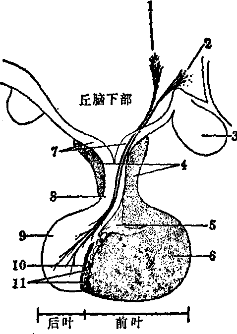 图1 脑垂体的组成及其与丘脑下部的关系 1.室旁核 2.视上核 3.视交叉 4.结节部 5.结缔组织 6.远侧部 7.正中隆起 8.漏斗柄 9.神经部 10. 中间部 11.中间部的囊泡 脑垂体的组成 脑垂体分腺垂体和神经垂体两部分。腺垂体源于原始口腔外胚层向背侧突出的Rathke囊。神经垂体源于间脑底部向腹侧的凸起,有细柄与丘脑下部相连。这二部分最后结合一起,组成脑垂体。腺垂体位于前方,新鲜时呈粉红色,分远侧部、结节部和中间部(图1)。神经垂体在后方,与中间部贴连,新鲜时显白色,分神经部(漏斗突)、漏斗柄和正中隆起(图1)。远侧部常称前叶,中间部与神经部合称后叶。 腺垂体 分远侧部、结节部和中间部,来源胚胎原始口腔向背侧突出的Rathke囊。在发生过程中,囊的前壁细胞增生变厚,形成远侧部和结节部。囊腔渐消失,成为一些大小不等的囊泡。囊的后壁很薄,形成中间部,与神经部紧贴一起。腺垂体由排列成团或索的腺细胞和丰富的窦状毛细血管组成。结缔组织很少,只存在于腺细胞之间和血管周围。 (1)远侧部: 此部最大,占腺总体积的75%(彩图4)。腺细胞集合成团或索。有些细胞组成滤泡。细胞团和索间充满丰富的窦状毛细血管。结缔组织除伴随较大的血管外,只有少量网状纤维围绕腺细胞和毛细血管。依胞质着色性质不同,腺细胞分嗜色细胞和嫌色细胞。根据胞质颗粒着色的特点,嗜色细胞又分嗜酸细胞和嗜碱细胞。但一般用以显示腺细胞的染料都是酸性染料,故“嗜酸”和“嗜碱”之称并不反映细胞内物质的酸碱性。人的三种细胞比例因个体和生理状况差异很大,嫌色细胞约占50%,嗜酸细胞35%,嗜碱细胞15%。曾以几种特殊染色法用于区分人和哺乳类腺细胞类型,但因观察种属和所用染色法的差别,对各种细胞的命名不一;有的用希腊字母命名,有的用被着色的染料命名,以致细胞名称较混乱。近年应用电镜和免疫细胞化学法对腺细胞的深入研究,趋于按细胞所产生的激素对每种细胞定名。 嗜酸细胞轮廓清楚,比嫌色细胞大,圆或卵圆形,直径14~19μm(彩图4)。高尔基复合体发达,有许多小杆状线粒体。胞质内满含分泌颗粒,易被伊红和桔黄G等染色。根据染色性质和颗粒形态,将细胞分二种。一种是促生长激素细胞,又名α细胞,数目较多,常聚集成群,分布于前叶后外侧部。粗面内质网丰富,高尔基复合体明显。有许多致密圆形颗粒,直径350~400nm(图2),分泌促生长激素。儿童患脑垂体嗜酸细胞瘤,可致巨人症;成人患此瘤时,致肢端肥大症。儿童缺少此种激素,则致侏儒症。此激素为蛋白质,对蛋白质、脂类和碳水化物的代谢起显著作用。它对骺软骨有特殊的刺激生长作用,影响人体的生长。另一种是催乳激素细胞,也名ε细胞,数目较少,多分散存在。颗粒形状不规则,直径约600nm(图2)。在不授乳的雌性动物,粗面内质网不多,高尔基复合体小。受孕和授乳期时细胞数目增多并变大。高尔基复合体发达,粗面内质网丰富,有中等数量的溶酶体。免疫细胞化学法证明,此种细胞分泌催乳激素。断乳时溶酶体增多,分解过剩的分泌颗粒和粗面内质网。肥大的细胞渐趋于不活跃状态。催乳激素为蛋白质,它促使和维持乳腺分泌; 在啮齿类也维持黄体的分泌功能。人患催乳细胞瘤时,虽未妊娠和授乳,也分泌大量乳汁。