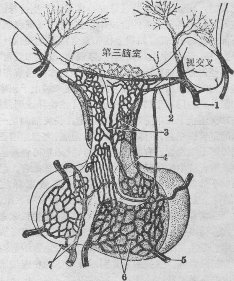 图3 脑垂体血液循环模式图 1.颈内动脉 2.脑垂体上动脉 3.初级毛细血管丛 4.脑垂体门静脉 5.脑垂体静脉 6.远侧部窦状毛细血管 7.脑垂体下动脉 脑垂体的血管和神经 血管分布具有特点,对腺垂体细胞的分泌活动有重要的调节作用(图3)。数条脑垂体上动脉发自颈内动脉和Willis动脉环,供应前叶。有的动脉直接入前叶,与窦状毛细血管相通。有的动脉在正中隆起和漏斗柄根部互相吻合,在正中隆起内形成初级毛细血管丛。此丛的毛细血管汇成数条静脉,称脑垂体门静脉,经漏斗柄和结节部中下行,通入前叶的窦状毛细血管(图3)。门静脉将丘脑下部神经细胞释放的几种调节腺垂体细胞分泌活动的物质(释放激素和释放抑制激素)由正中隆起输入前叶,调节腺细胞的分泌活动。颈内动脉发出脑垂体下动脉,供应后叶。前叶和后叶的毛细血管各汇成静脉,通入海绵窦。前叶的毛细血管比后叶的大,两者都是有孔毛细血管。前叶有交感和副交感神经纤维,似属血管运动神经。 ☚ 内分泌系统 松果体 ☛ 脑垂体hypophysis cerebri 脑垂体 脑垂体hypophysis亦称“垂体”、“脑下腺”。内分泌腺。在脑的基底部,位于颅底蝶鞍的垂体窝内,通过垂体柄与下丘脑相连。分为腺垂体和神经垂体两部分。腺垂体分为前部、结节部和中间部;神经垂体分为神经部、漏斗柄和灰白结节的正中隆起。是重要的内分泌器官,其结构复杂,内含数种内分泌细胞,分泌多种内分泌素,其作用广泛,并能调节其他内分泌腺的活动。 ☚ 内分泌系统 甲状腺 ☛ |