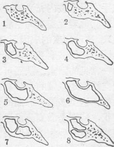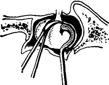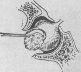 图7 肌肉块填塞鞍腔防治术后脑脊液漏 垂体柄切断术 可以阻断垂体的分泌功能,被用以治疗与垂体前叶激素密切相关的肿瘤,特别是晚期乳腺癌和前列腺癌的更加恶化。手术经额下入路,将额叶牵向后上方,显露出垂体柄并在其上夹上一银夹,继将垂体柄剪断。剪断垂体柄时要紧挨着垂体一侧,且不可将垂体柄向下牵拉,否则易损伤下丘脑。由于术后垂体门脉系统容易迅速再生,使垂体恢复其分泌功能,所以这种手术的效果难以持久。 垂体切除术 手术的目的是将正常垂体完全切除,以消除其分泌功能。手术适应证为晚期乳腺癌、前列腺癌、糖尿病性视网膜病变。手术可经额下入路,首先切断垂体柄,挖除全部垂体,再用Zenker液毁坏可能残留的垂体组织。垂体切除术亦可经蝶窦入路进行,暴露鞍底后将鞍底硬脑膜作十字形切开,从垂体表面与各硬脑膜瓣间进行分离,显露出整个垂体的前面,再轻轻地将垂体向下压,找出硬脑膜与垂体表面的间隙,沿此继续分离垂体上面,达垂体柄及鞍膈孔为止。如鞍膈孔较大,可在蝶鞍腔内发现一蛛网膜憩室,慎勿将它撕破。此时即可用尖端圆钝的小剪,紧挨着垂体表面,将垂体柄作低位剪断(图8)。因为切断的位置越高,越容易导致永久性尿崩症。接着从外侧、下方和后方作同样的分离,完整地取下垂体。在使用手术器械在鞍内操作的各步骤,均须在电视监视下进行,以防器械活动范围超过了鞍膈水平。