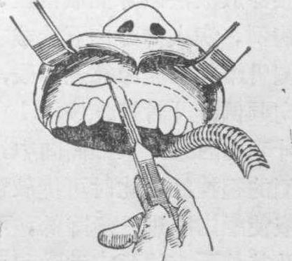 图4 经蝶窦入路时的切口 (2) 经蝶窦入路:术前需拍片了解蝶窦的结构(图3),术前三天开始作鼻腔手术前各项准备。气管内插管全身麻醉,并将插管固定在患者左侧口角。取仰卧位头稍后伸。手术切口处及鼻中隔粘膜下用1%普鲁卡因加1:2000的肾上腺素溶液浸润。口腔内填塞无菌长纱条。铺巾时只露出鼻尖和上唇。在上唇上齿龈交界处作两犬齿间的横切口(图4)。由鼻前嵴突及鼻底剥离切口下的粘膜骨膜层,切除鼻前嵴突,剥离鼻底粘膜并将鼻中隔粘膜推向两侧。切除鼻中隔前部软骨的下1/3部分,并留下为以后填入蝶窦用。再向后上剥离,显露出犁骨前端亦切除之。插入鼻腔镜,此时即显露出整个蝶窦底部。由蝶窦口向后切除蝶窦底和其中隔。将蝶窦粘膜切除直至显露出鞍底(图5)。将双目手术显微镜对准手术野,在X线电视下观察,凿开鞍底,使之成为宽1.5cm、长1.0cm的骨窗,将硬脑膜电凝后作十字形切开,这时观察肿瘤组织是否在表面露出,有时肿瘤组织自行挤入蝶窦,用取瘤钳或刮匙,分块切除瘤组织(图6)。当鞍内相当空虚时,鞍上部分肿瘤,常亦自行沉落入鞍内,继续进行切除,直到看见正常腺体组织或鞍膈。为了防止发生脑脊液漏,在切除鞍膈处肿瘤时,勿将此处的蛛网膜撕破。在切除鞍底部肿瘤时,不可将硬脑膜层当作肿瘤包膜广泛切除,因为此系由海绵窦的内侧壁延续到鞍底的,损伤后可致严重出血。肿瘤全部切除后,鞍内空腔用肌块填塞,将手术中切下的鼻中隔软骨嵌于鞍底骨窗的两缘,防止肌块脱出。用丝线缝合牙龈处切口。两侧鼻腔均匀地用纱布条填塞。手术后按一般鼻腔手术后的原则处理,并按情补充激素。预防脑脊液鼻漏是本手术的一个特殊问题。如术中突然大量脑脊液流出,表明鞍膈处的蛛网膜已破裂,可用肌块填塞鞍腔,或从大腿外侧取一片带有肌肉的阔筋膜片(图7),将带肌肉的一面塞进鞍内,让它周围的筋膜紧贴在蝶窦上壁,再在筋膜后面填塞纱布条。术后第三天逐步松动纱布条,一周后取出纱条。如此后仍有脑脊液漏,可作腰椎穿刺放置导管进行持续引流,直至漏液停止。