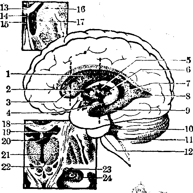图1 脑室的侧面和冠状切面 1. 侧脑室体部 2. 室间孔 3. 侧脑室前角 4. 中脑导水管 5. 第三脑室 6. 松果体上隐窝 7. 侧脑室三角部 8. 侧脑室后角 9. 侧脑室下角 10. 第四脑室11. 中孔 12. 侧孔 13. 胼胝体 14. 第五脑室 15.透明隔 16. 尾状核 17. 侧脑室前角 18. 胼胝体19.尾状核 20. 侧脑室体部 21. 第三脑室 22. 丘脑23.尾状核尾 24. 侧脑室下角
